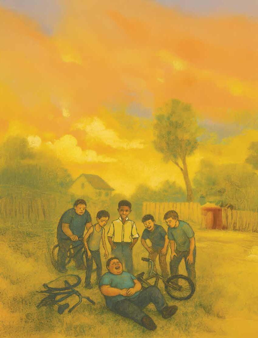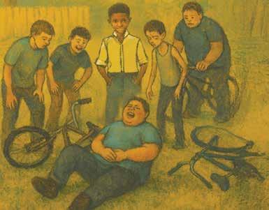 One time we were racing down those hills and decided to split up. Some went down one and some on the other. I was on the hill with Fat Boy and Scraper. When we started, we were all going fast, and if you’ve ever gone down a hill fast then you understand the rush you get. The problem was that Fat Boy’s brakes were messed up. So at the spot where we usually slow down and let the bikes take over, he wasn’t slowing down. Scraper and I were yelling “Fat boy!” But all our yells did was scare o a bunch of cats, and all we could do was watch as Fat Boy sailed over the center of the U, which is a long mound of grass, and then BAM! He came down hard on his seat and then kept going into someone’s yard and that’s when he fell over.