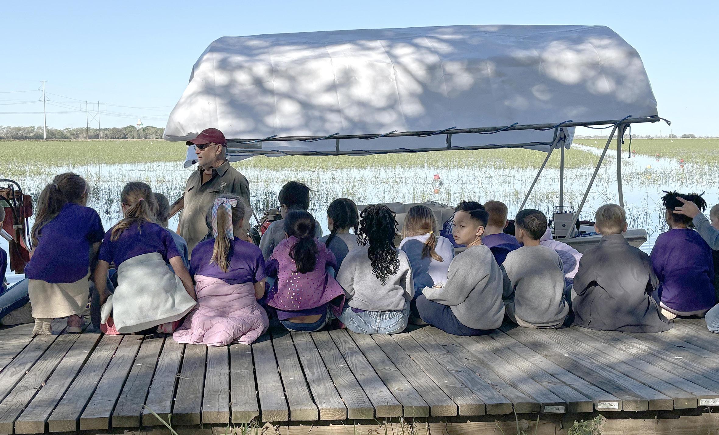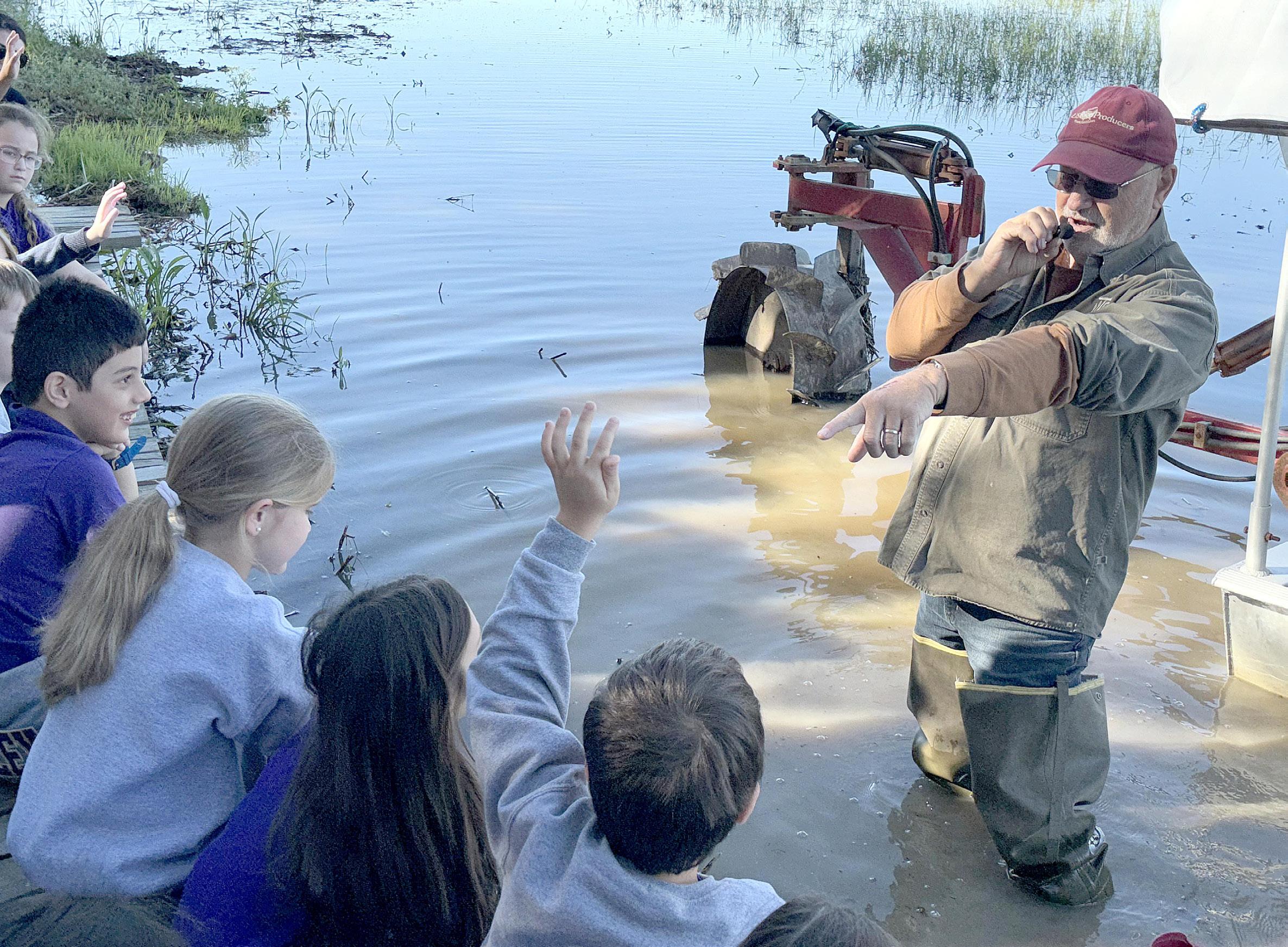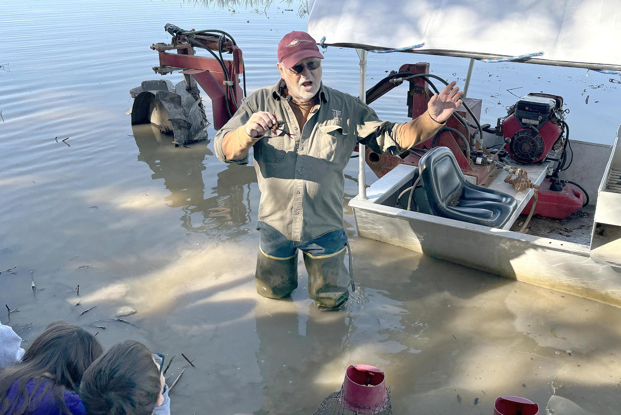 “This farm is a food factory — on this farm we’re going to hopefully catch about 100,000 pounds of crawfish this year — this is where your food comes from,” he said to an elementary class full of eager students last week. “All