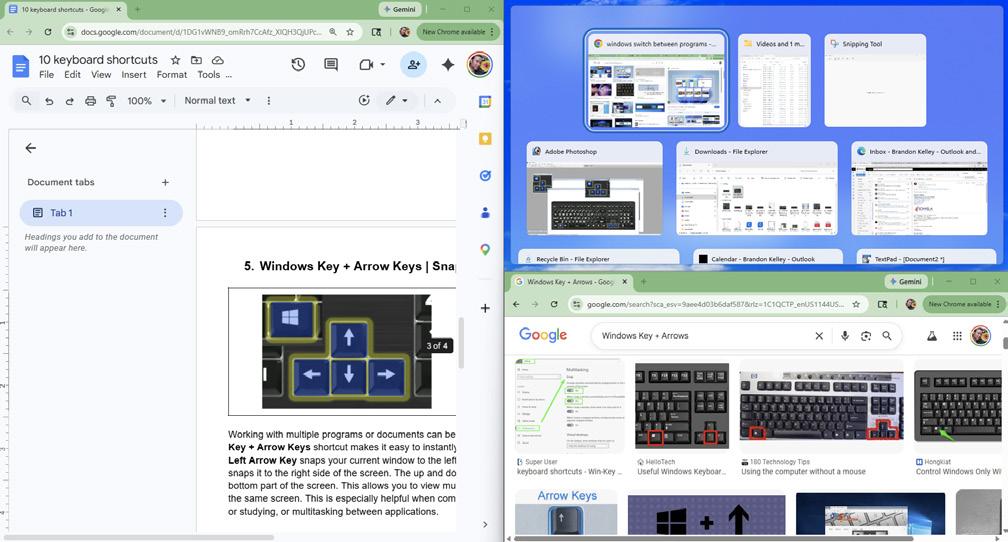 instantly organize your workspace. Pressing the Windows Key + Left Arrow Key snaps your current window to the left side of the screen, or Windows Key + Right Arrow Key snaps it to the right side of the screen. The up and down arrow keys maximize to full-screen and minimize your current window respectively. This allows you to view multiple programs, documents, or windows side by side on the same screen. This is especially helpful when comparing documents, referencing information while reading or studying, or multitasking between applications.