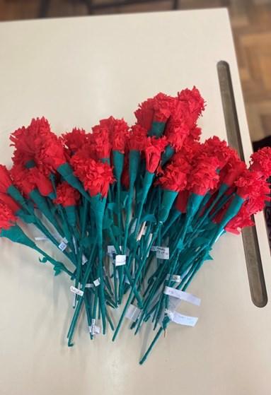 No âmbito das atividades dos 50 anos do 25 de Abril, nas aulas de EV, fizemos cravos em papel crepe. A escolha da cor dos cravos foi para simbolizar a revolução do 25 de Abril de 1974. Fizemos passo a passo, nas aulas, e foi uma atividade simbólica, divertida e interessante. Fizemos bastantes para distribuirmos na marcha
