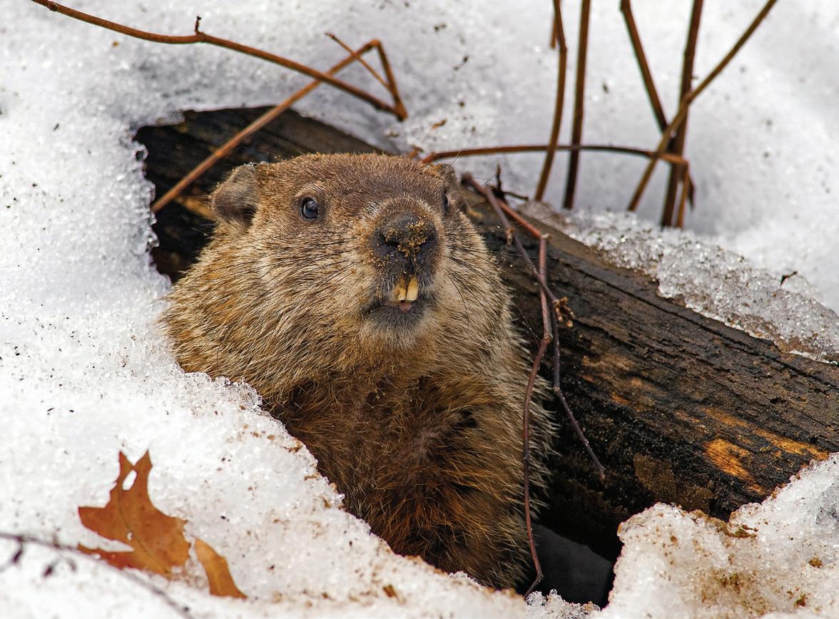 Groundhogs are solitary apart from mating season. They spend summer and early fall bulking up on a mostly plant-based diet, with slugs and grubs as occasional garnishes. They also use their powerful front claws to create complex burrows. Their underground abodes stretch up to 50 feet over several levels with multiple entrances and chambers. Once temperatures drop, groundhogs retreat to these palatial homes and enter hibernation. They oscillate between long periods of torpor and short periods of arousal. Their heart rate plunges from 80 to five beats per minute and their body temperature falls from 98 to 38 degrees, about the same as inside a refrigerator. Groundhogs lose up to a third of their body weight in this altered state.