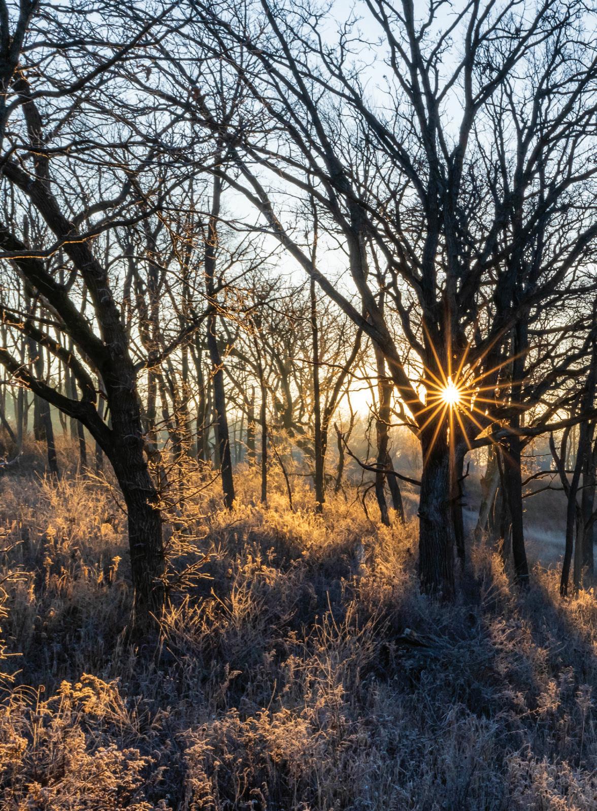 A sunburst captured through the trees on a frosty morning at Lakewood Forest Preserve (Wauconda).