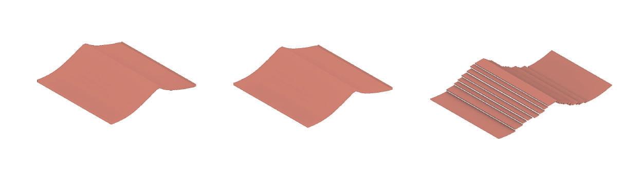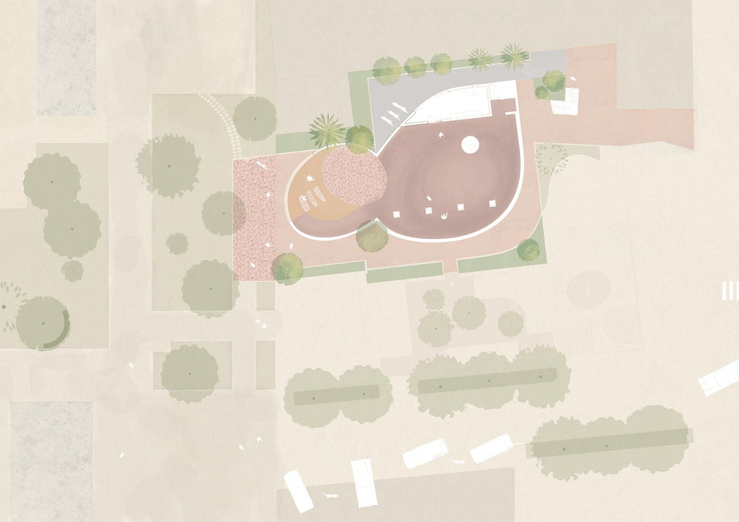竹田臨梅雨季,瞬間強降雨帶來豐沛的水資源。 半地下層為弧形的下凹空間,降雨時可充當蓄洪池,提供當地部 分產業使用。