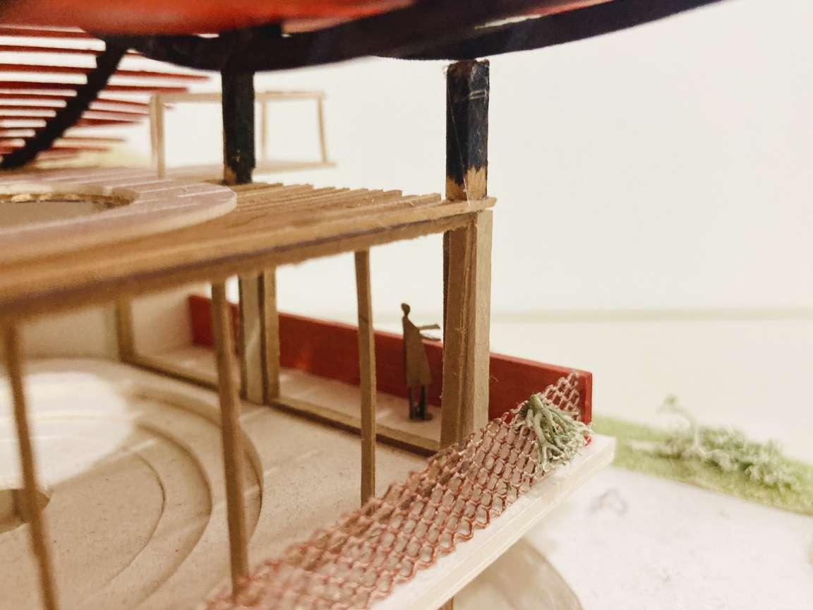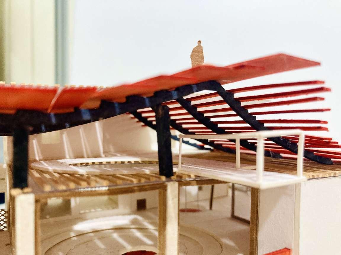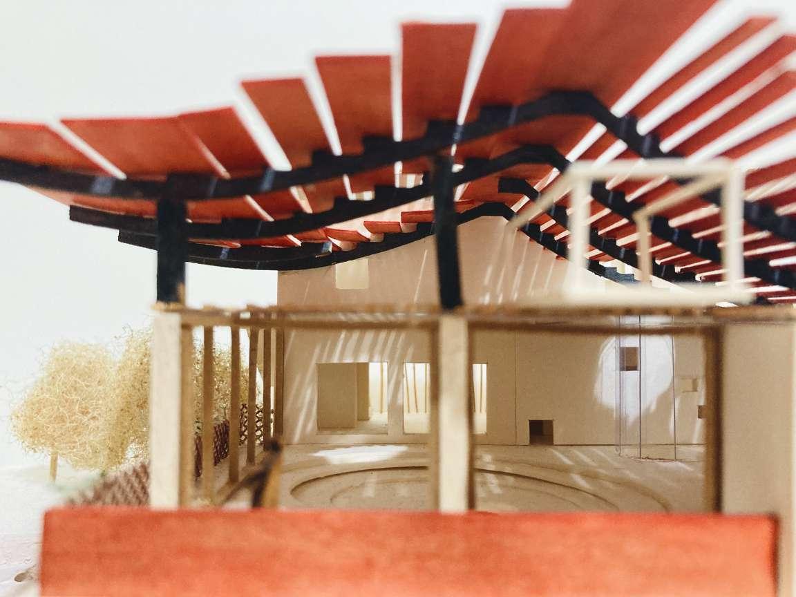 階梯式屋頂將光線碎化,以防直射並提供遮陰、通風。