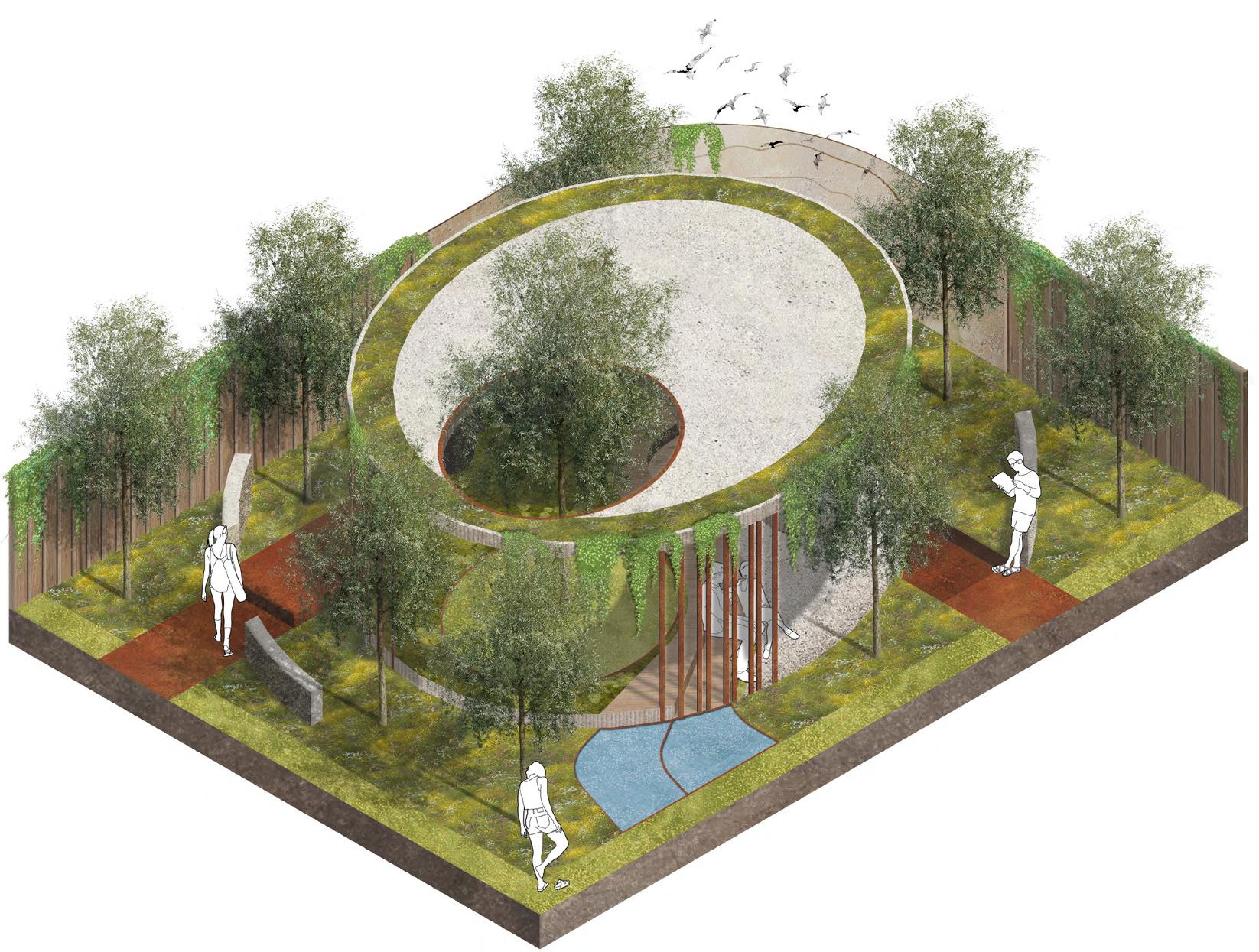 Thisgardenproposalisa12mx9mmediumsizedgarden,consistingofahighlyplantednatural openwoodland,withafeaturefloatingcanopyandaloungeareainitsheart.Theuseofcurves andorganicshapesgivesthesenseofbeinghuggedandcosy,likeina“zenheaven”.