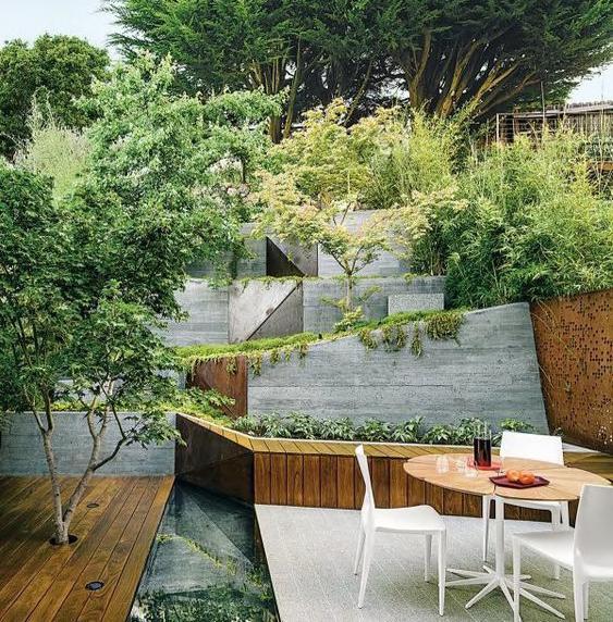 feature stone walls timber decking timber structures feature planting lawn existing retained hedge concrete floor/ micro-cement porcelain tile paving