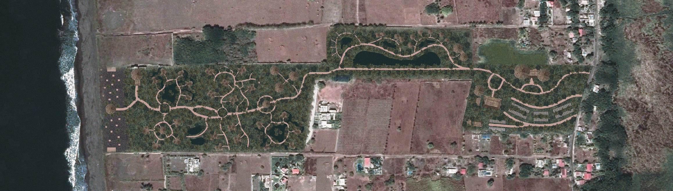 An outdoor restaurant on the beach of Monterrico, featuring two modules with different transparencies in their walls and a fully equipped mini bar. The design is inspired by the national tree of Guatemala.