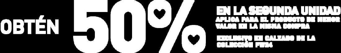 Obtén 50% OFF en la segunda unidad, aplica para el producto de menor valor en la misma compra, exclusivo en calzado de la colección FW24