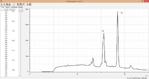 The X-ray fluorescence spectrum shows the components of brass CuZn36. By comparing the intensities of pure copper and zinc, the mass fractions can also be determined (in this case 64% Cu and 36% Zn).