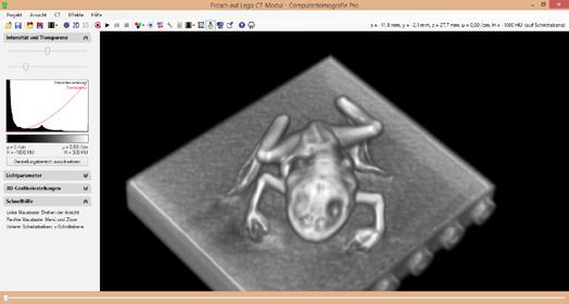 Whilst the frog rotates in front of the X-ray image sensor, the software assesses the computed tomogram in real time.