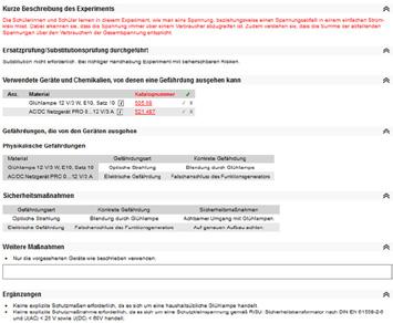 beurteilungen. Diese nennen alle Gefährdungen, die vom Experiment ausgehen können. Sie haben die Möglichkeit, eigene Kommentare bezüglich der Raumsituation und Lerngruppe zu ergänzen. Die Gefährdungsbeurteilungen sind komfortabel jedem Science Lab-Versuch zugeordnet und können abgespeichert oder ausgedruckt werden.