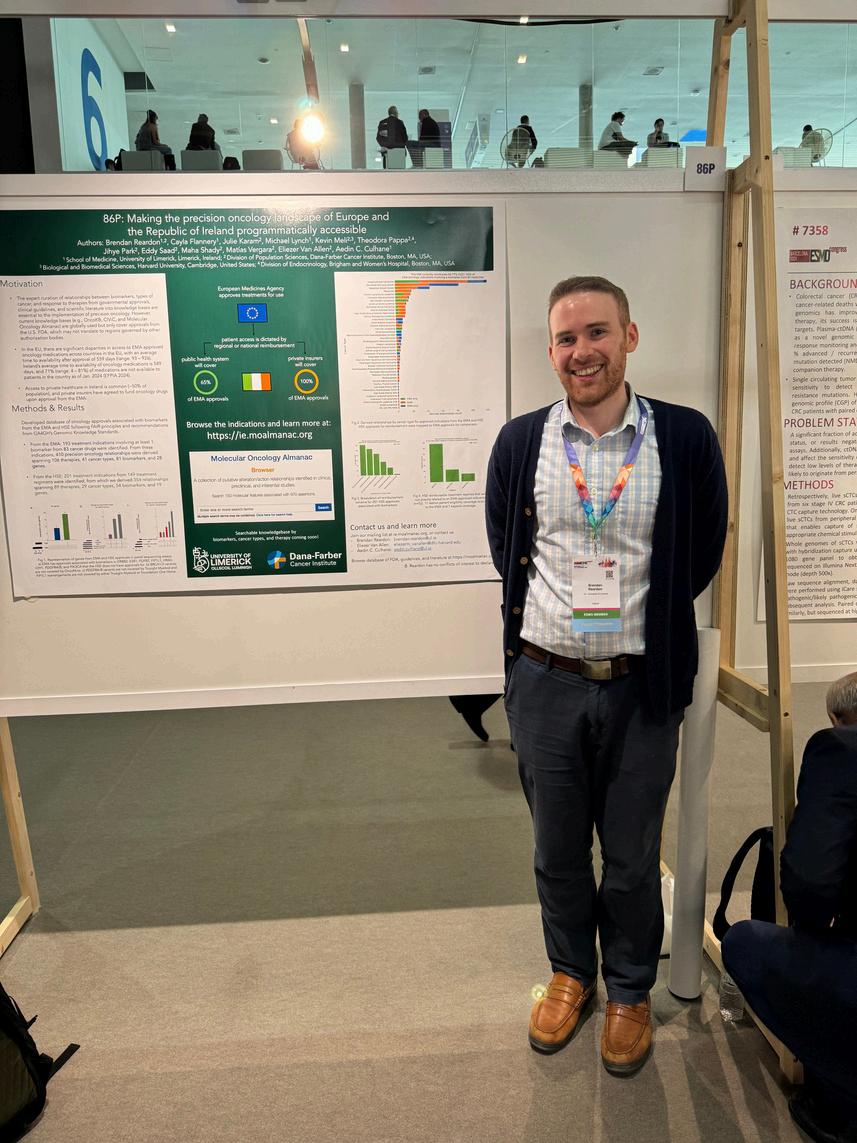 Second year graduate student Brendan Reardon (from the Culhane lab) attended and presented a poster titled “Making the precision oncology landscape of Europe and the Republic of Ireland programmatically accessible” at this year’s European Society of Medical Oncology meeting in Barcelona, Spain in September 2024.