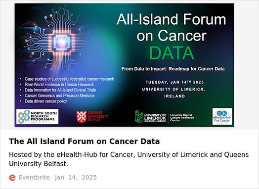 On January 14th eHealth-Hub for Cancer will host an All Island Forum on Cancer Data at the University of Limerick. This conference will bring together international and all-island clinical, academic and industry leaders to discuss federated data infrastructure and requirements to connect, access and analyse clinical and genomics cancer data across institutes and hospitals.