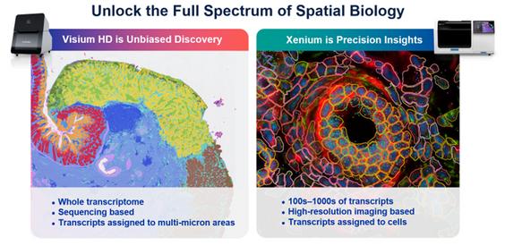 When it comes to 10x spatial offerings, we have taken complementary and parallel paths in the development of class leading spatial tools. Which tool to use is largely dependent on two factors - the type information you want to gain from the experiment and 2) your prior knowledge of their research/disease system