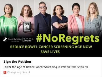 THE MARIE KEATING FOUNDATION IS CALLING ON OUR GOVERNMENT TO REDUCE THE AGE FOR BOWEL CANCER SCREENING FROM 59 TO 50.