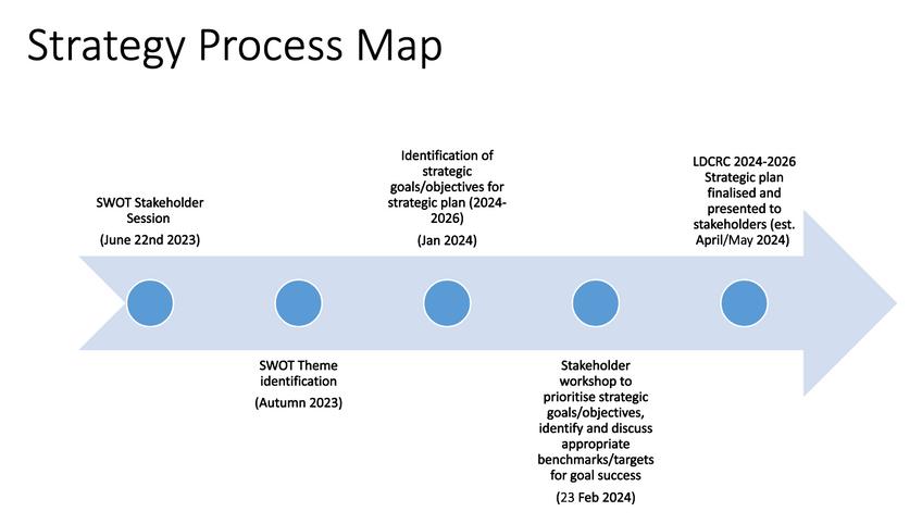 This series of strategic planning began in June 2023, with a SWOT (strengths, weaknesses, opportunities, and threats) assessment A SWOT is a strategic management tool to help take stock of an organization's internal characteristics, or its strengths and weaknesses, and can be used to develop strategy, prioritize projects, and refine goals The LDCRC SWOT engaged participants, from multiple academic disciplines, clinical, and health-related areas.