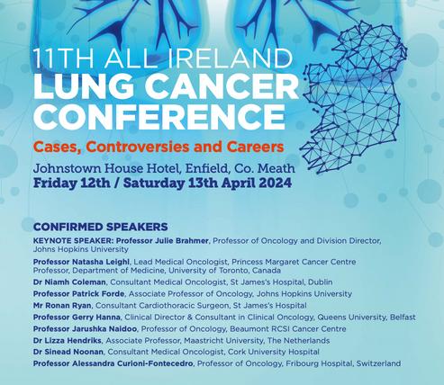 The All Ireland Lung Cancer Conference will be held on the 12th and 13th of April 2024. The focus of the conference is to stay up-todate with the staggering advancements in lung cancer diagnosis and treatment, to encourage the career development of young oncologists, and of course, to bring us together in person – the power of which cannot be underestimated. This exciting programme brings together international speakers from the US and Europe.
