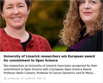 Dr Maria Doyle, Bioconductor Community Manager, and Professor Aedín Culhane, Professor of Cancer Genomics both based at UL’s School of Medicine, have won a Young European Research Universities Network (YERUN) Open Science Award 2023 for their work on the Bioconductor project.