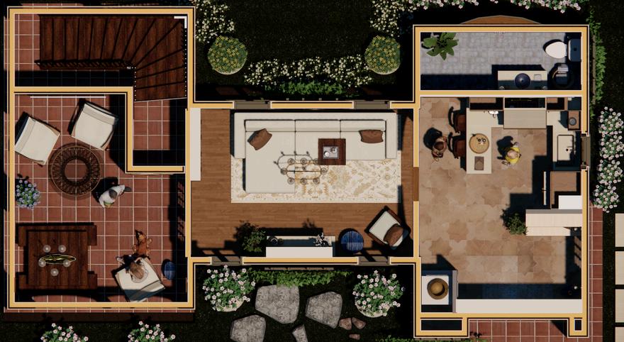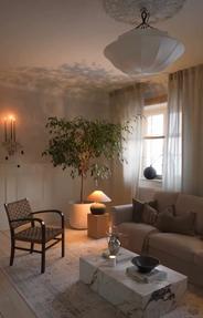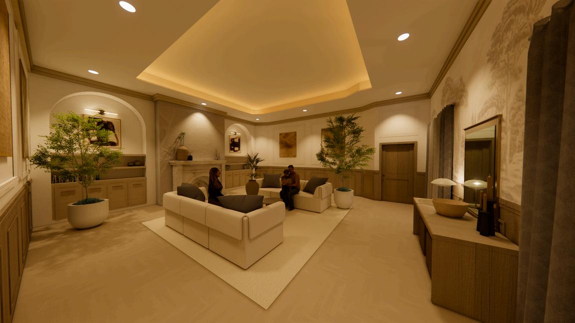 For this project the idea was to create multiple spaces that embody a harmonious fusion of classical elegance and contemporary warmth, creating an inviting and sophisticated atmosphere Soft, neutral tones dominate the palette, enhancing the sense of serenity, while warm ambient lighting accentuates the architectural details, such as the coffered ceiling and arched alcoves. The symmetrical layout, plush seating, and organic elements such as potted greenery and textured wall art foster a balanced and intimate setting. A refined mix of traditional and modern materials, from rich wood paneling to sleek furnishings, ensures timeless appeal, making this a perfect sanctuary for relaxation and refined gatherings