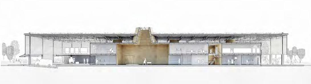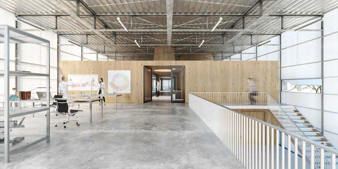 La réhabilitation du Bâtiment 14A et la Construction de la Halle sont pensées comme un seul et même projet avec la même préoccupation de niveau de performance et de continuité. La Halle, conçue comme «un volume capable» est un vaste espace libre de toute contrainte structurelle et protégé des intempéries par une enveloppe légère. Sur le princiepe de «boite dans la boite», les espaces d’usage sont librement implantés au grès des besoins et des usages.