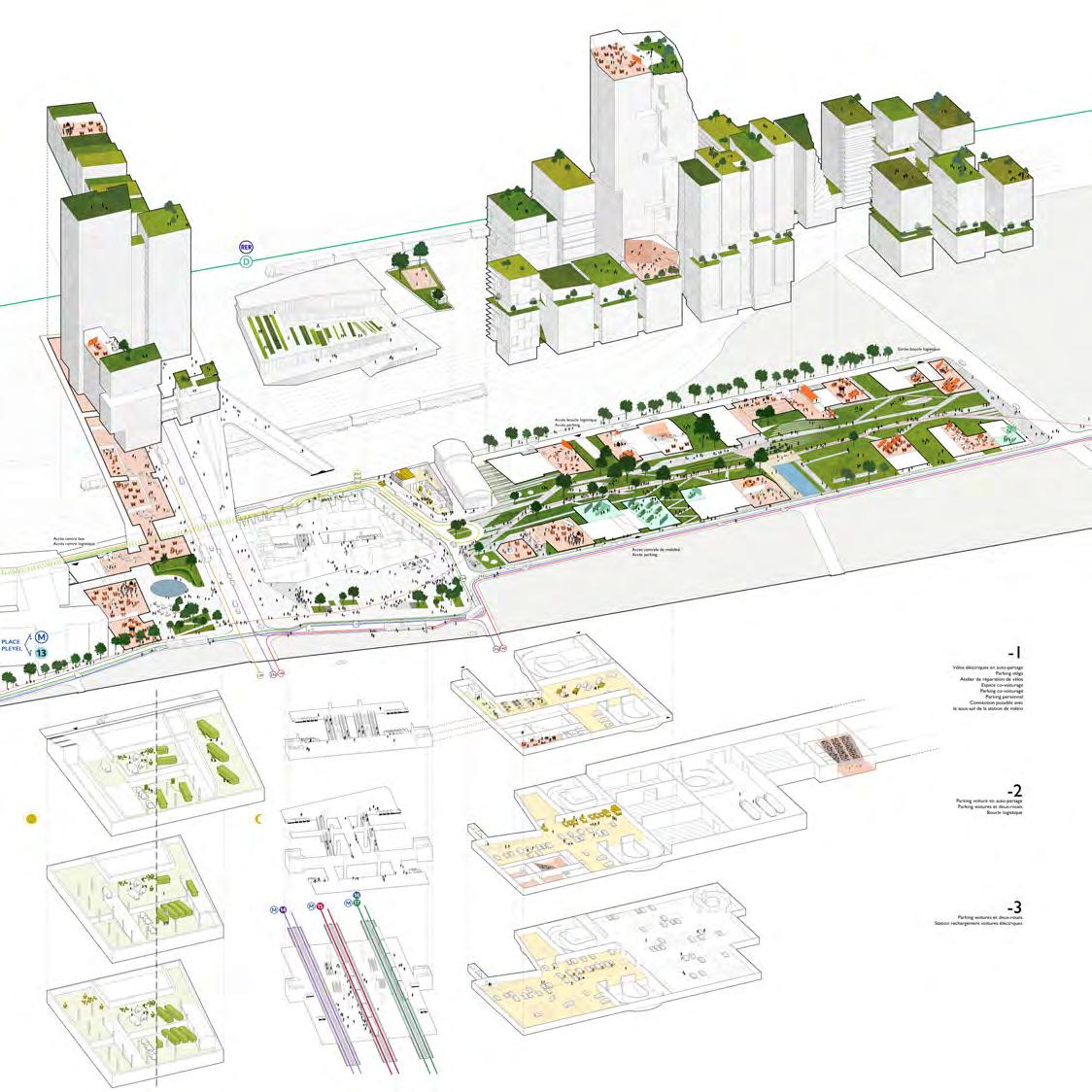 Conçu avec une architecture sobre et élégante, ce pavillon n’est sans rappeler le vocabulaire utilisé par Kengo Kuma pour concevoir Station Pleyel. Désireux de l’afficher clairement comme un satellite la gare, nous avons imaginé ce bâtiment comme contenant d’un gramme unique en Europe. La Centrale de mobilité est un lieu au public, dont l’objectif est de fournir une offre de mobilité diversifiée, complémentaire aux transports en commun. Située entre la le méta îlot, elle bénéficie d’une position stratégique et d’une sibilité auprès des usagers du quartier. Avec l’objectif de favoriser nouvelles mobilités et de fournir la solution la plus adaptée pour déplacement, ce pôle regroupe un large panel de services mutualisé, auto-partage, flotte de vélos partagés, atelier de réparation ouvert à tous, station multi-énergie de recharge de véhicules, zone diée au covoiturage et aux véhicules en libre-service (type Autolib, Cityscoot…), espace convivial d’attente et d’informations, conciergerie et consignes.