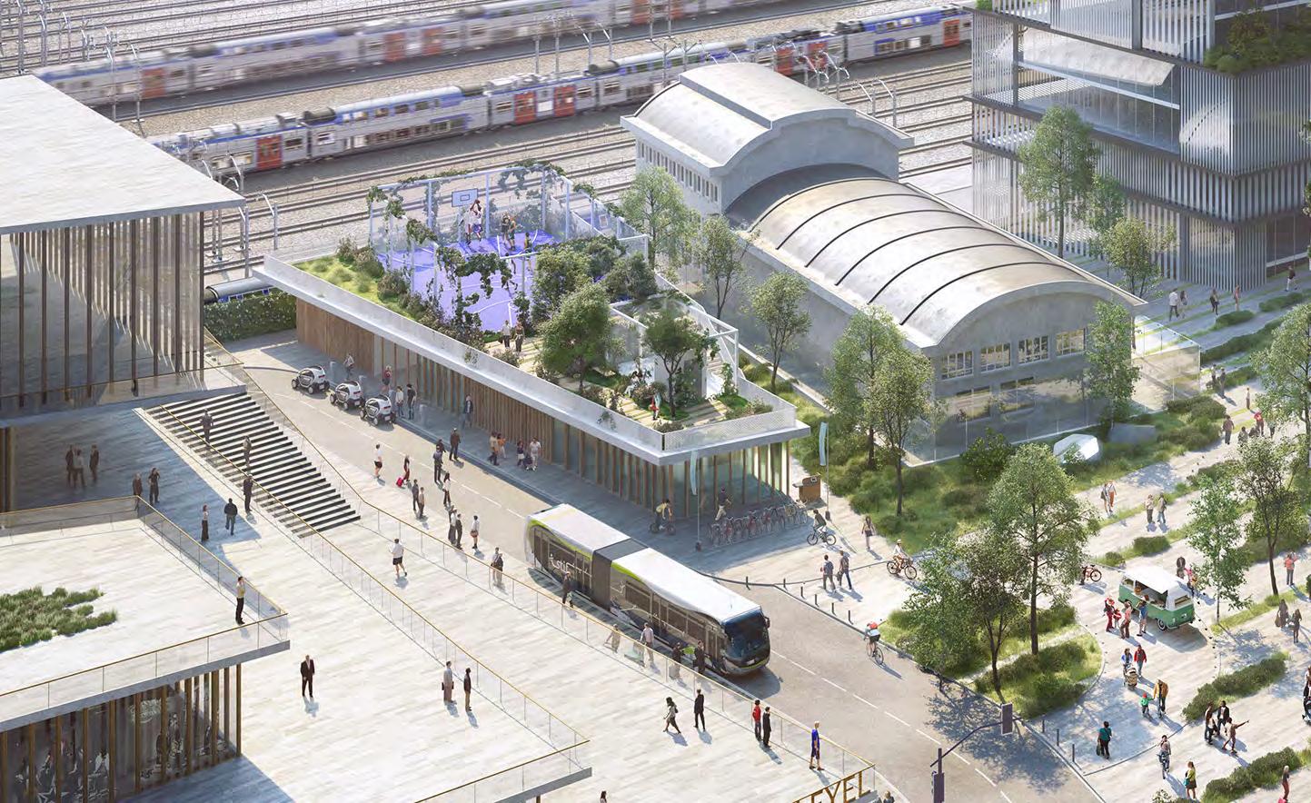 Conçu avec une architecture sobre et élégante, ce pavillon n’est pas sans rappeler le vocabulaire utilisé par Kengo Kuma pour concevoir la Station Pleyel. Désireux de l’afficher clairement comme un satellite de la gare, nous avons imaginé ce bâtiment comme contenant d’un programme unique en Europe. La Centrale de mobilité est un lieu ouvert au public, dont l’objectif est de fournir une offre de mobilité diversifiée, complémentaire aux transports en commun. Située entre la Gare et le méta îlot, elle bénéficie d’une position stratégique et d’une forte visibilité auprès des usagers du quartier. Avec l’objectif de favoriser les nouvelles mobilités et de fournir la solution la plus adaptée pour chaque déplacement, ce pôle regroupe un large panel de services : parking mutualisé, auto-partage, flotte de vélos partagés, atelier de réparation ouvert à tous, station multi-énergie de recharge de véhicules, zone dédiée au covoiturage et aux véhicules en libre-service (type Autolib,Vélib, Cityscoot…), espace convivial d’attente et d’informations, conciergerie et consignes.