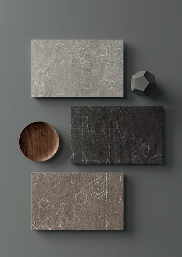 Line, Dot e Mark sono le tre varianti sui fondi in finitura naturale declinate sui quattro colori della serie, che riproducono graficamente lavorazioni tipiche della pietra e texture del mondo tessile. Si integrano con le tonalità del fondo dando l’illusione di un rilievo, in realtà perfettamente pulibile. Ricreano leggeri effetti materici combinabili alle finiture naturale e lappata dei moduli di base.