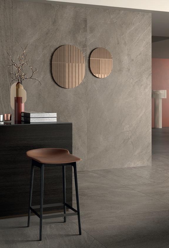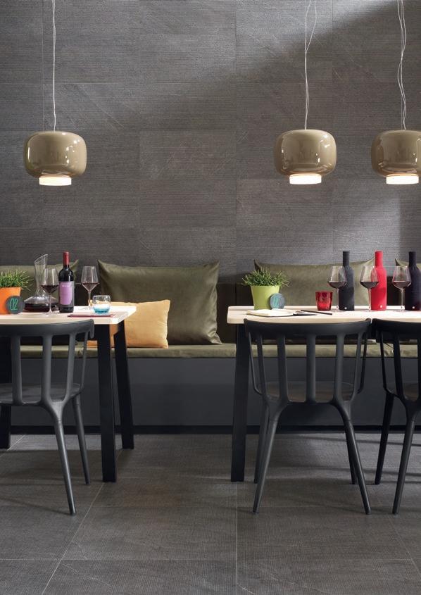 A restaurant with a suspended atmosphere, in which the austere solidity of the stone effect meets the essential charm of the graphic elements. The large slim format expands the sophisticated range of greys and creates a monolithic total look, whose depth is enhanced by the counter and architectural volumes.