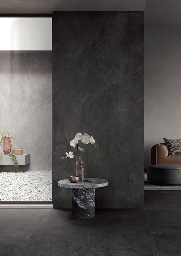 A large living room, characterized by light and dark effects, which creates a discreetly elegant environment around the material temperament of the Next Dark slabs. The honed finish of the 120x120 Slimtech floor tones down daylight with a soft and diffused effect.