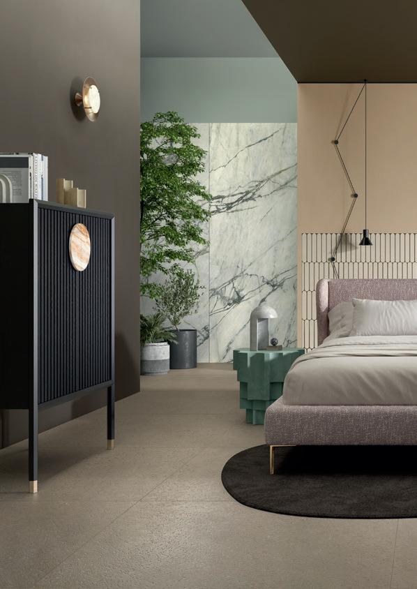 Una suite di profonda intensità narrativa. Le superfici a pavimento e a rivestimento evidenziano al meglio il carattere raffinato dell’ambiente. Intense Toffee, nella sua tonalità calda e avvolgente e nel mosaico Pills, si combina perfettamente con Calacatta Emerald, evidenziando la massima flessibilità compositiva della collezione: accostamenti unici per ambienti curati in ogni dettaglio e dalla forte personalità stilistica.