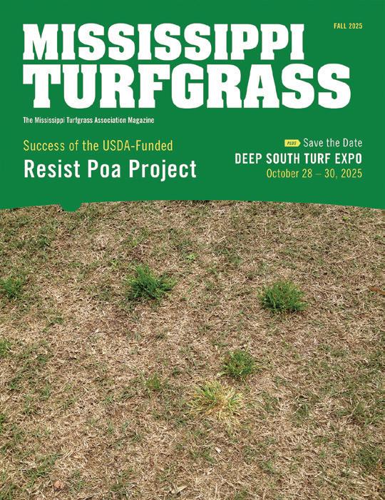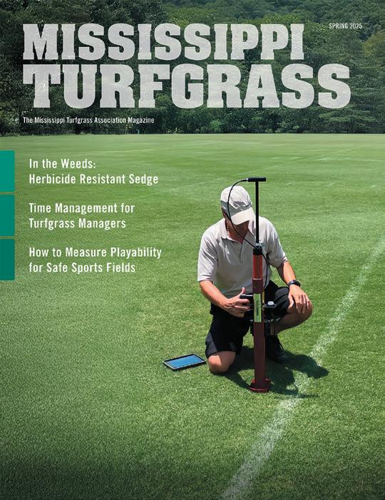 Mississippi Turfgrass is the Mississippi Turfgrass Association magazine. Subscriptions are complimentary to MTA members. The statements and opinions expressed herein are those of the individual authors and do not necessarily represent the views of the association, its staff, its board of directors, Mississippi Turfgrass, or its editors. Likewise, the appearance of advertisers, or their identification as MTA members, does not constitute an endorsement of the products or services featured in any issue of Mississippi Turfgrass. Copyright © 2026 by the Mississippi Turfgrass Association. Mississippi Turfgrass is published quarterly. Subscriptions are complimentary to members of MTA. Presorted standard postage is paid at Jefferson City, MO. Printed in the U.S.A. Reprints and Submissions: MTA allows reprinting of material published here. Permission requests should be directed to MTA. We are not responsible for unsolicited freelance manuscripts and photographs. Contact the managing editor for contribution information. Advertising: For display and classified advertising rates and insertions, please contact Leading Edge Communications, LLC, 206 Bridge Street, Suite 200, Franklin, TN 37064, (615) 790-3718, Fax (615) 794-4524.