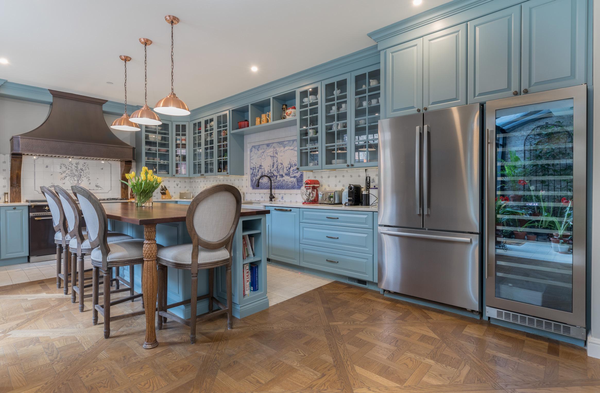Upon entering through the double-door foyer, the home reveals its meticulously refined interior. The front office or family room transitions smoothly into a radiant dining room, promising an environment of warmth and welcome. The chef’s kitchen, equipped with a Lacanche stove, built-in wine fridge, and an expansive wooden island, overlooks quintessential neighborhood charm, bringing the outside in. A custom Delft tile backsplash signifies the homeowner’s personal touch, setting this space apart from typical renovations.
