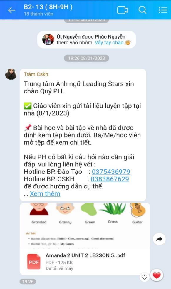 ✓ Chú ý tin nhắn, thông báo của Leading Stars trên nhóm zalo học tập chung và hộp thư zalo riêng để cập nhật các thông tin về con.