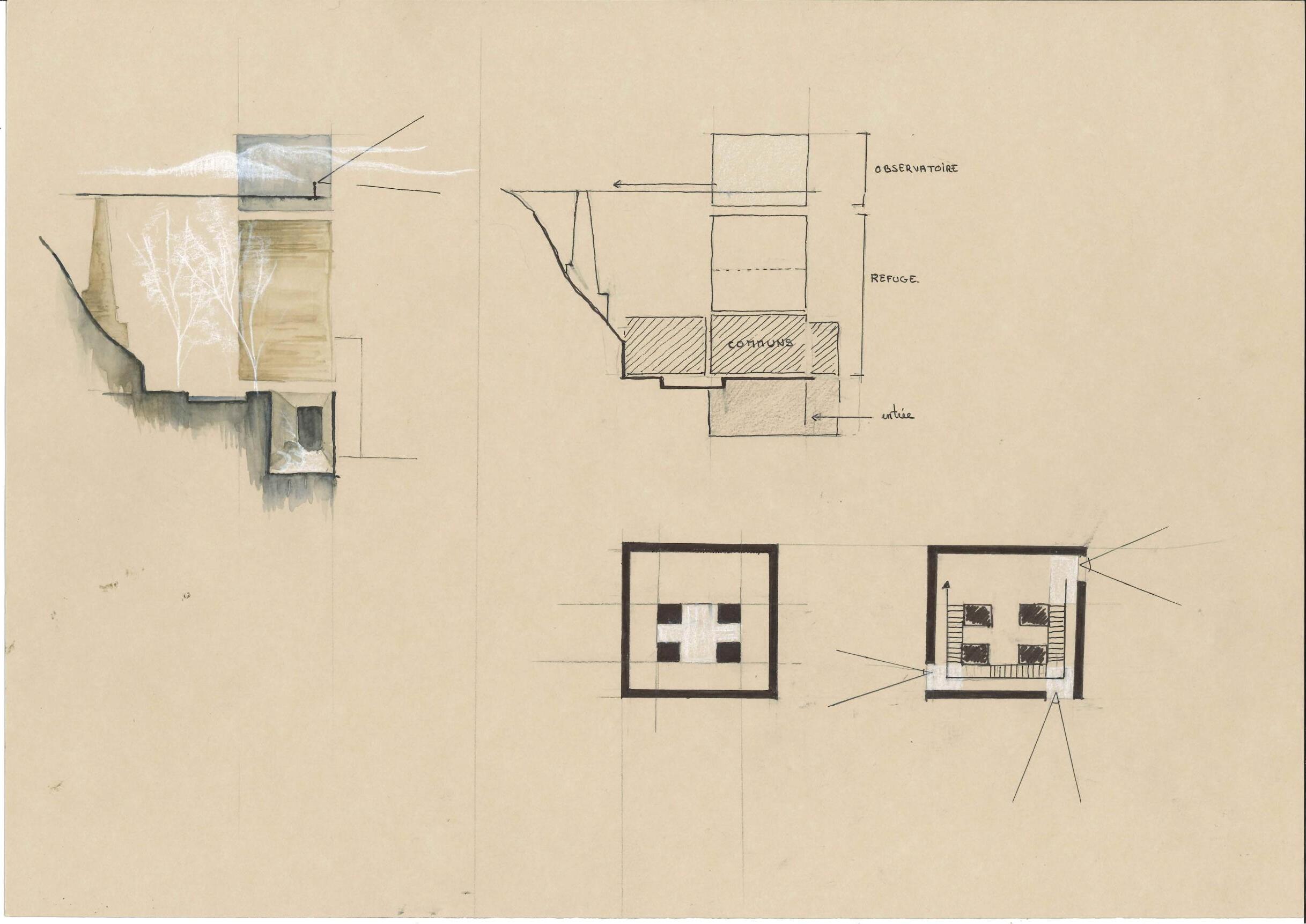 Cette proposition se définit par un observatoire sur la partie supérieure, offrant une vue sur les rives de l’Ourthe et des alentours, puis d’un espace refuge développé autour du concept de module cabine-dortoire, avec tous les usages qui s’y rattachent tels que les sanitaires et des espaces communs.