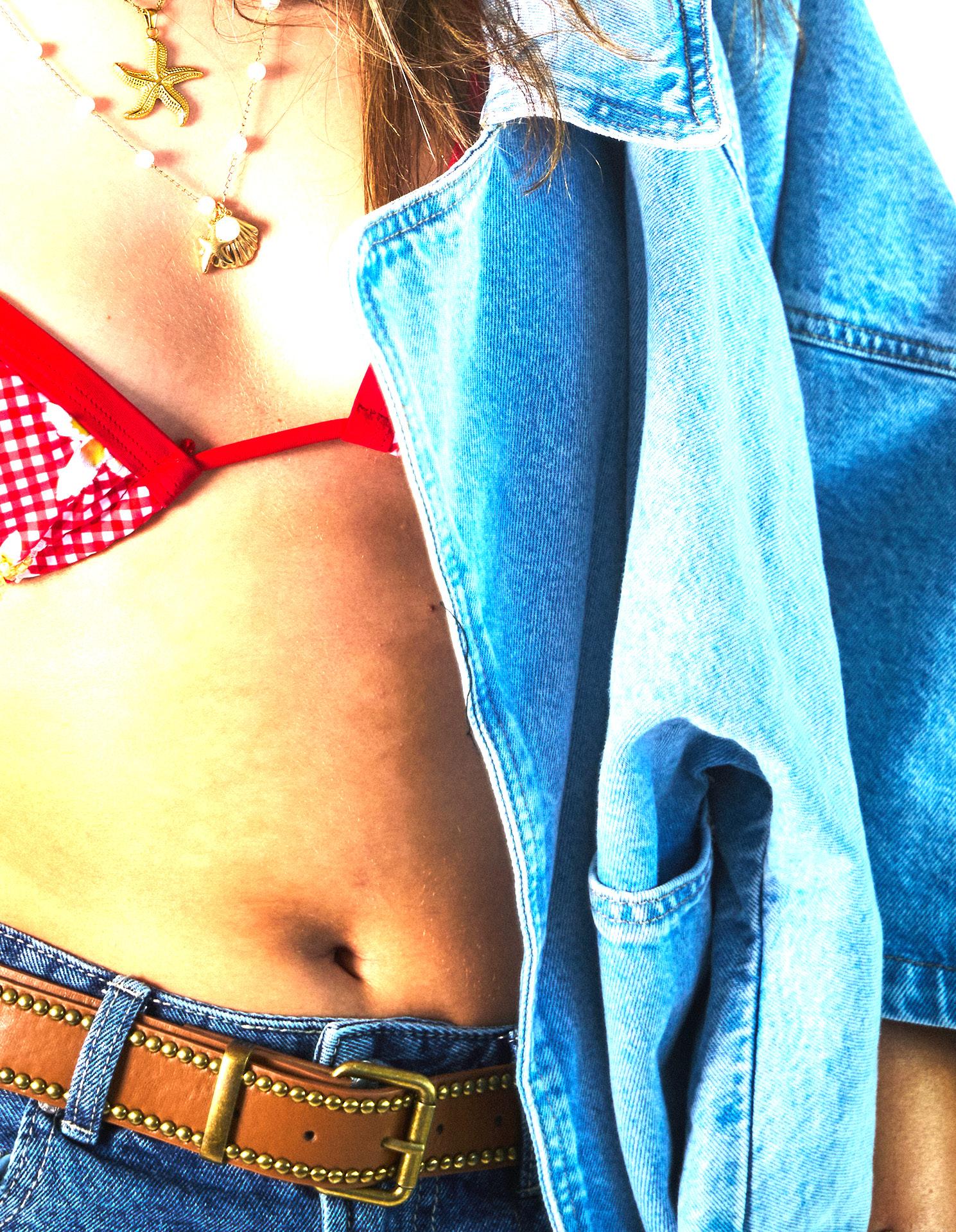 For styling, since this was a ‘club’ studio shoot showcasing how to wear the bikinis while clubbing in Ibiza, I aimed for pieces that were both subtle yet bold to complement the swimwear. I incorporated double denim and sequins into the looks, both trends that were hugely popular in the 90s and perfectly aligned with the vibe I wanted to capture. While the bikinis remained the centrepiece of each outfit, I carefully selected these styling pieces to elevate the overall look without overshadowing them. The balance between statement textures and the swimwear helped create a cohesive, fashionable narrative that feels authentic to Ibiza’s nightlife and the era’s style.
