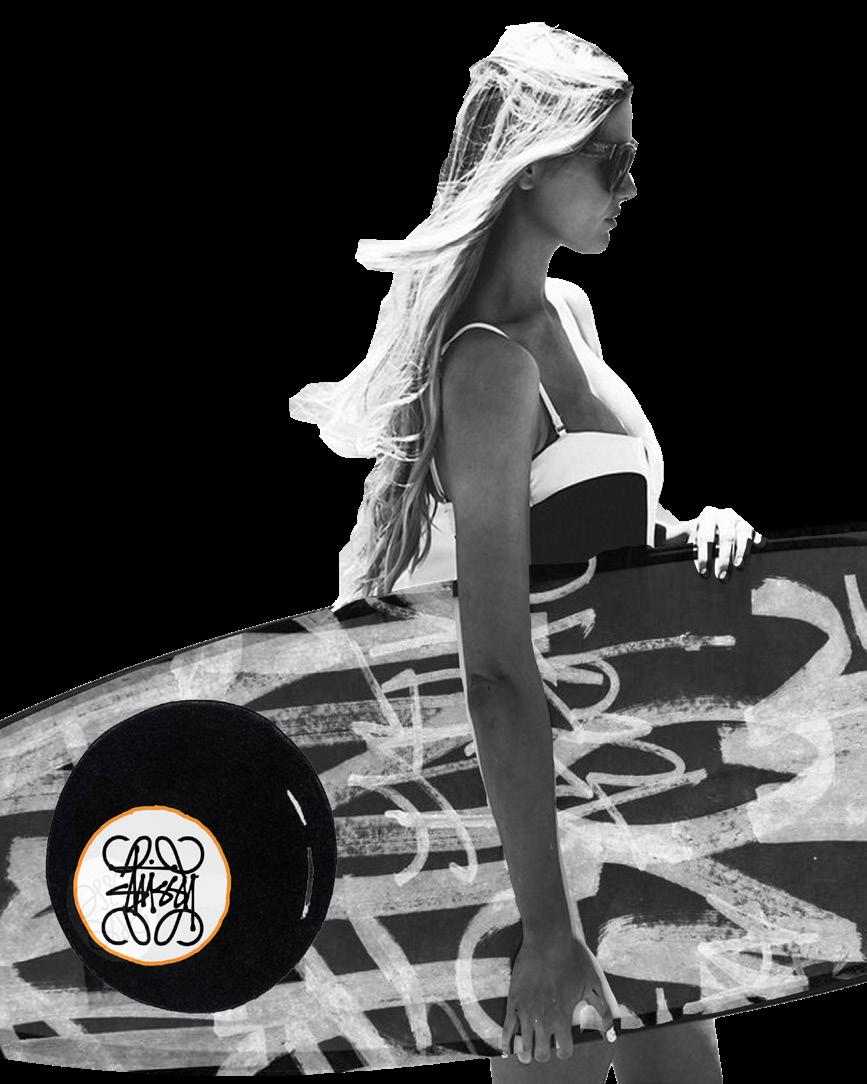 BECAUSE OUR STUSSY X LOEWE COLLECTION IS BASED ON THE BEACH AND ABOUT THE SURF CULTURE, WHY NOT DESIGN A SURFBOARD TO WEAR WITH THE MATCHING HAT, OR EVEN MIX AND MATCH WITH THE MATCHING SWIMSUITS.