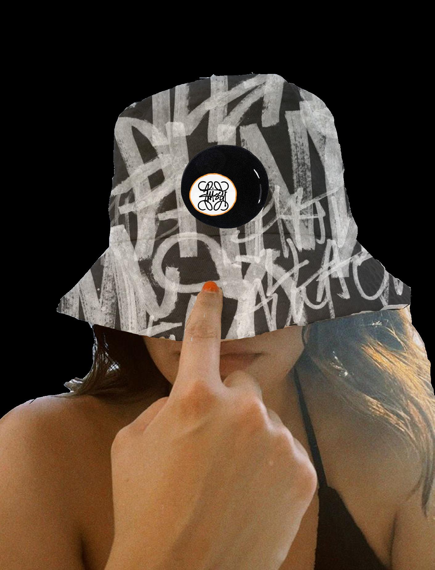 THE STORY BEHIND THE HAT IS TO SHOW THE ORIGINS OF STUSSY BY USING THE GRAFFITI AND TRYING TO PERSUE THAT INTO A LUXURY MARKET. THE GRAFFITI SHOWS A SENSE OF REBELLION, WHICH REFLECTS THE COLLABORATION BETWEEN STUSSY AND LOEWE AS THEY HAVE COMPLETELY DIFFERENT MARKET LEVELS AND CONSUMERS.