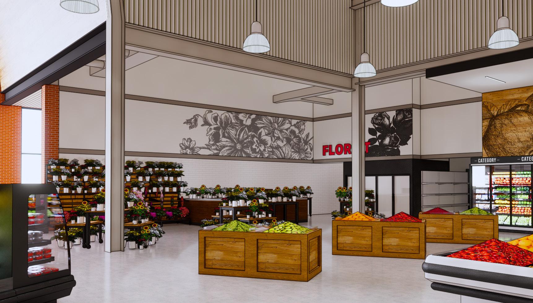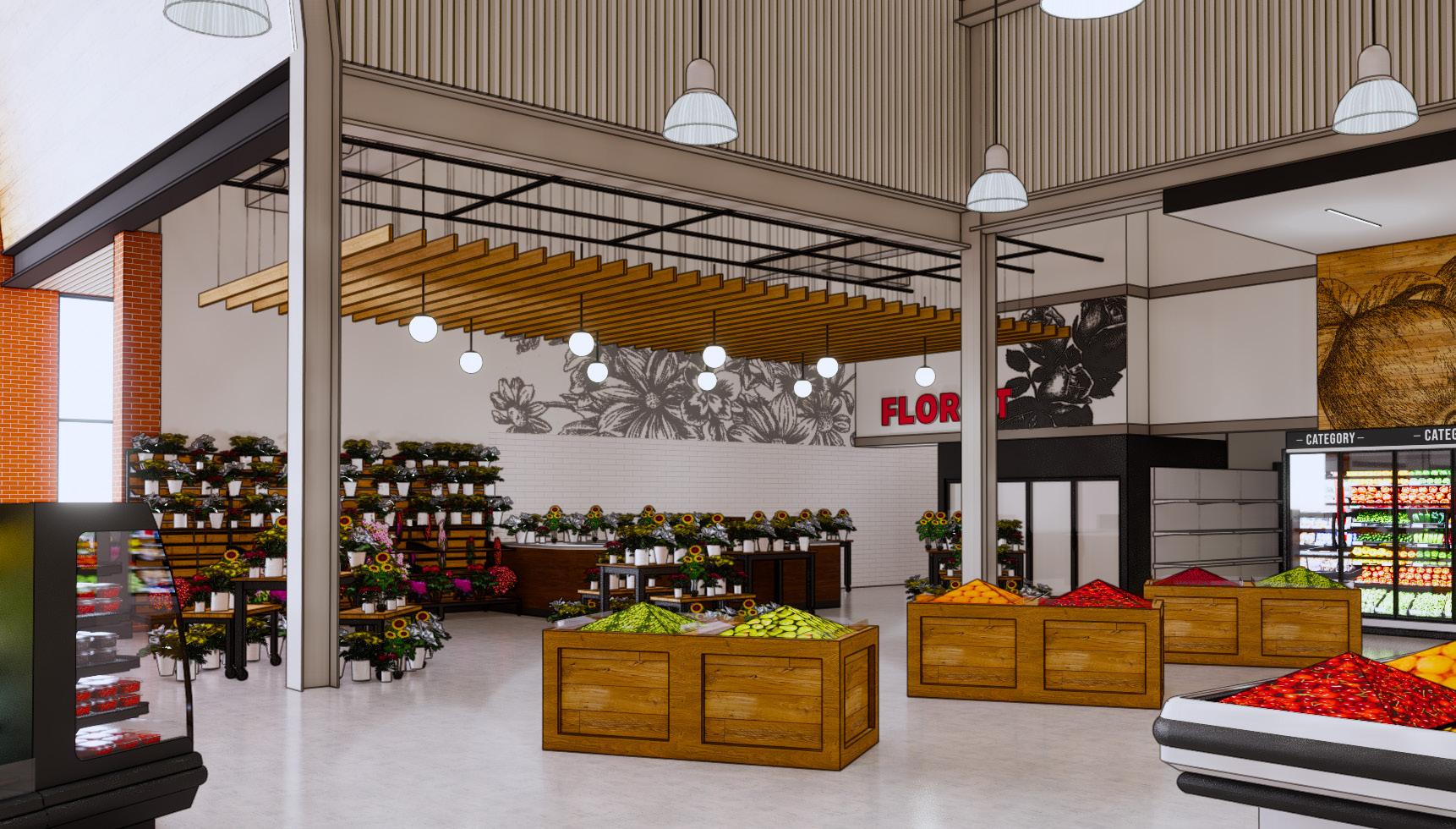 In the store on the left, the client was asking for some ways to refresh their existing store. With a competitor moving in near by, they wanted to spruce up the space, without a long construction project. The team put together a few options, relying on ceiling elements and wall graphics to freshen up the look. Ultimately, the client utilized a variety of wood ceiling elements in the floral space as well as others. These were quick to instal since they were prefabricated, panelized systems.