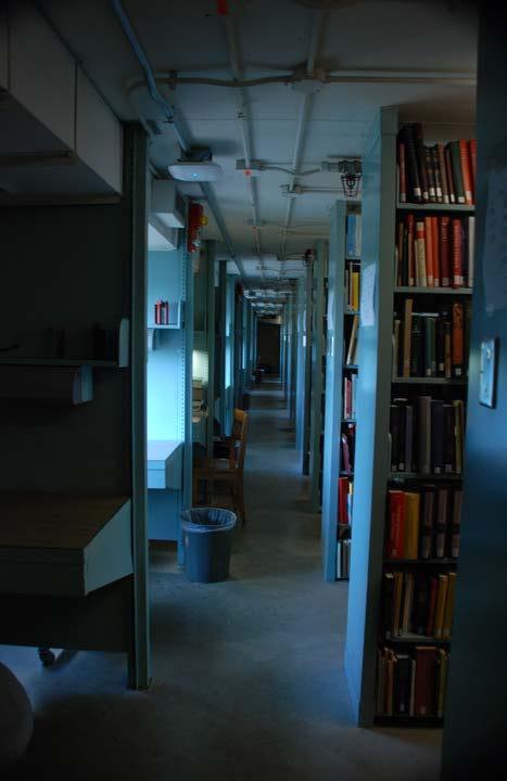 Early on we decided that the lighting system should be comprised of two things: ambient lighting and task lighting. Students surveyed pointed out that the study carrels could be a bit secluded, which can be both a positive and negative attribute (photo in the lower right corner of page 20). In order to keep the space feeling safe, we decided to keep it open and well lit. Lights were installed in the paneling, and the partitions between desks are louvered to allow for visibility down the row. At the seated eye line the louvers got closer together to help minimize distractions for studying.