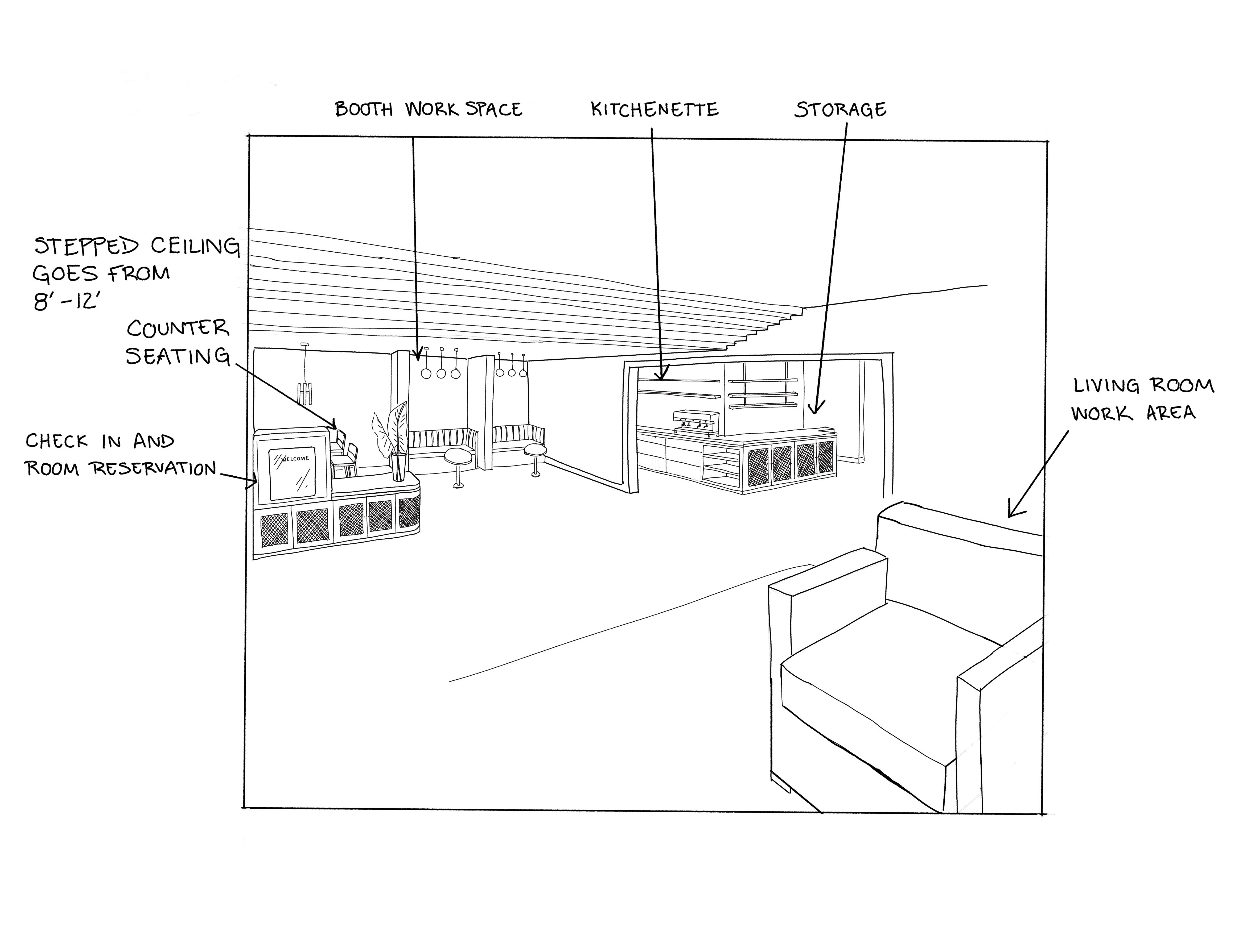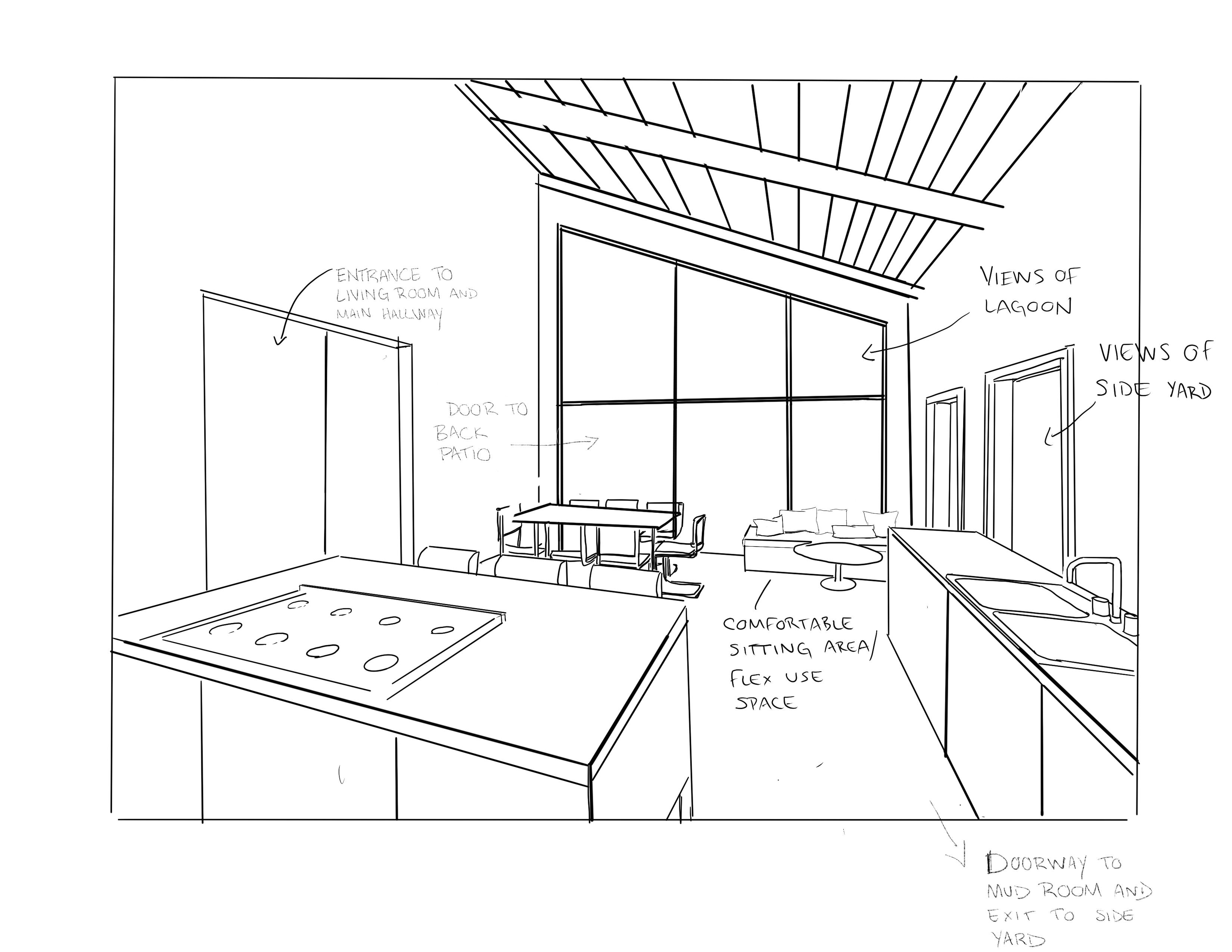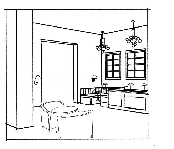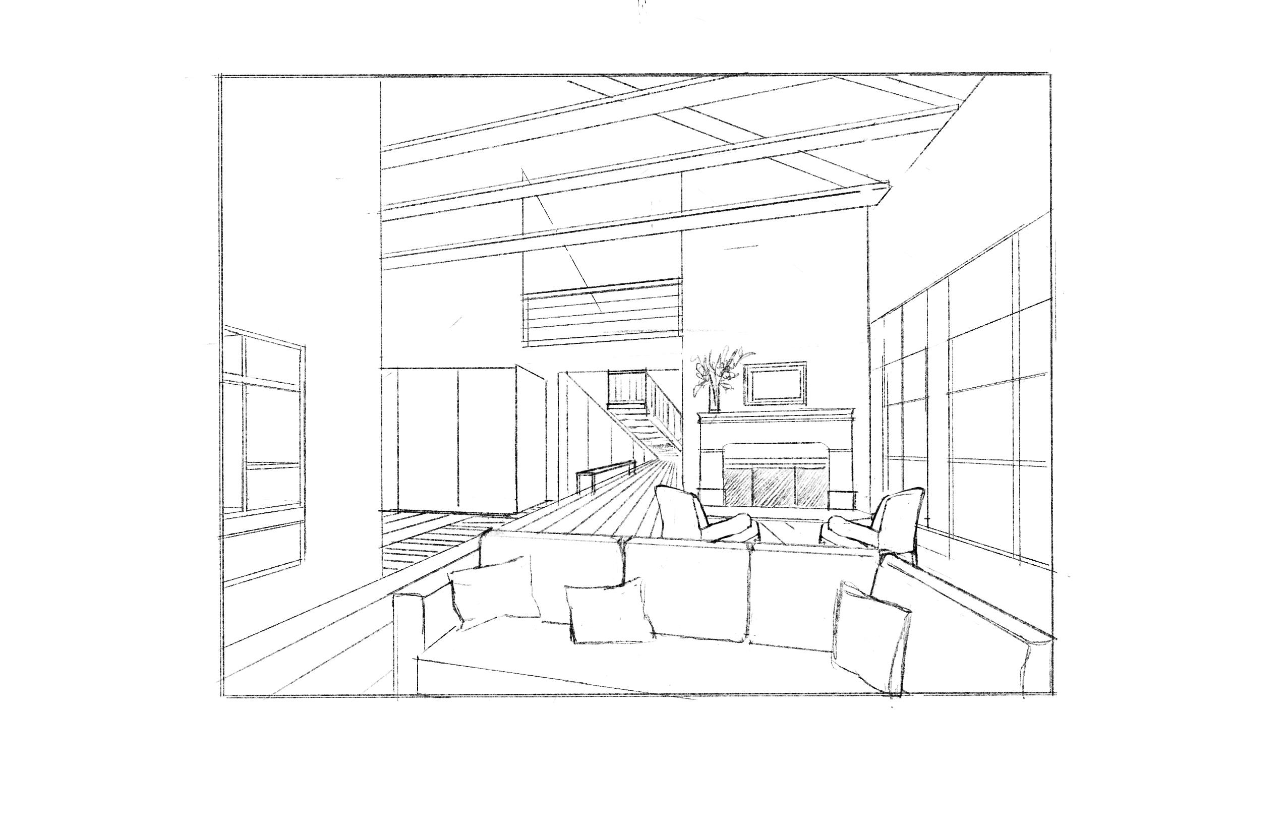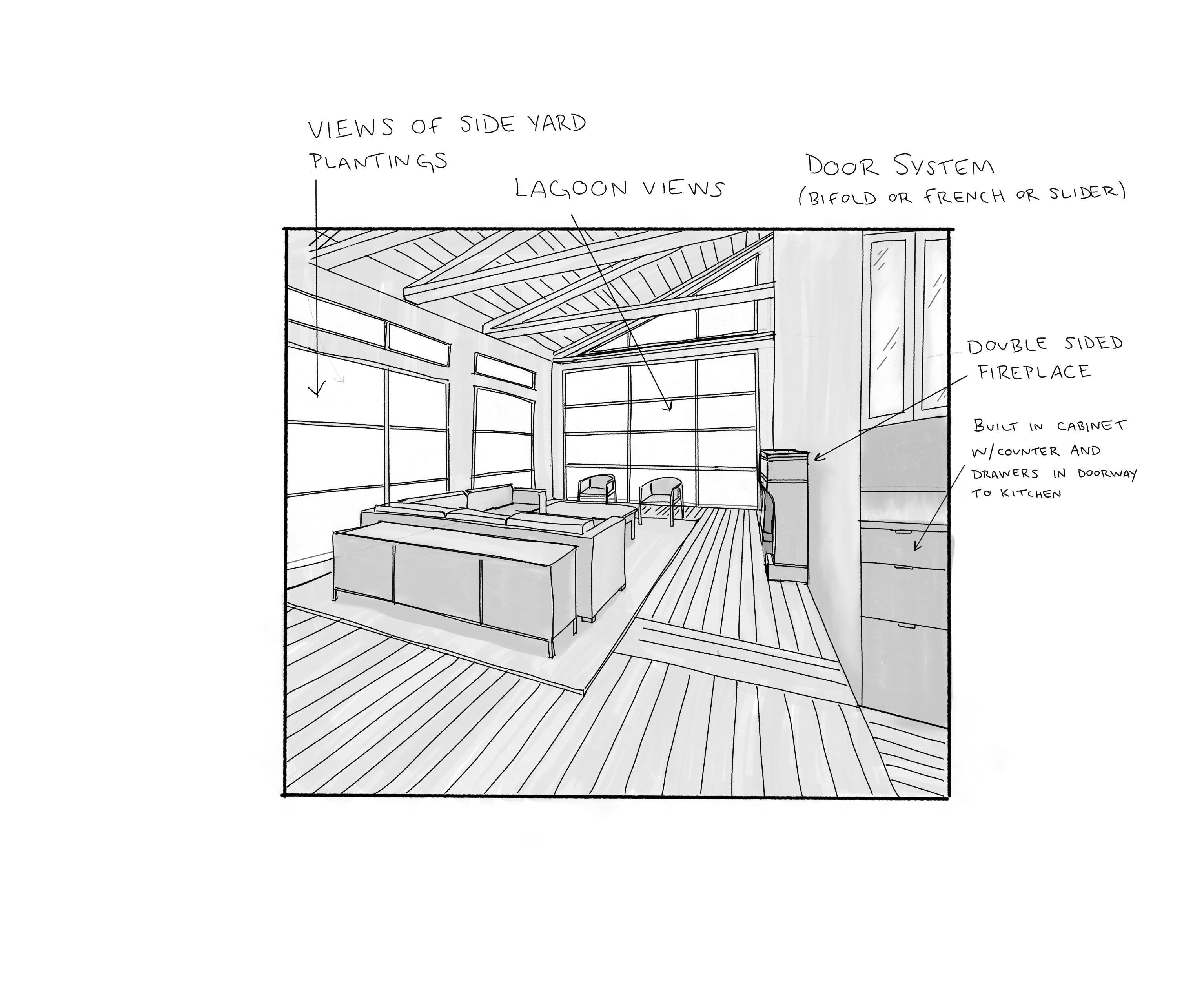 > An early sketch design ideation. The betweenopening the cocktail lounge and living room is half frosted glass with wood slats that offers privacy for guests in the lounge and allows light from the courtyard to filter through to the living room.