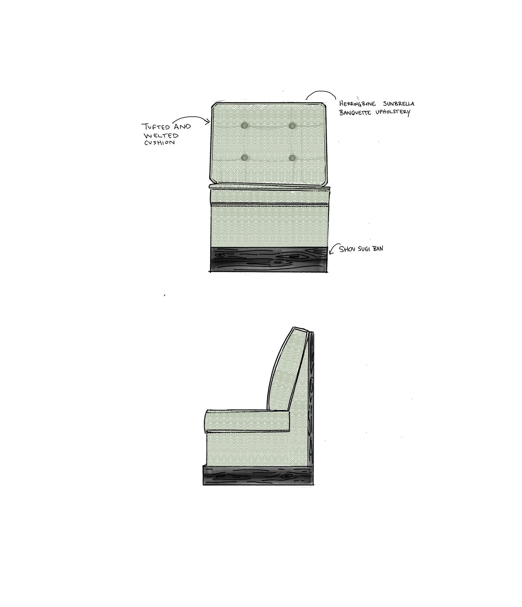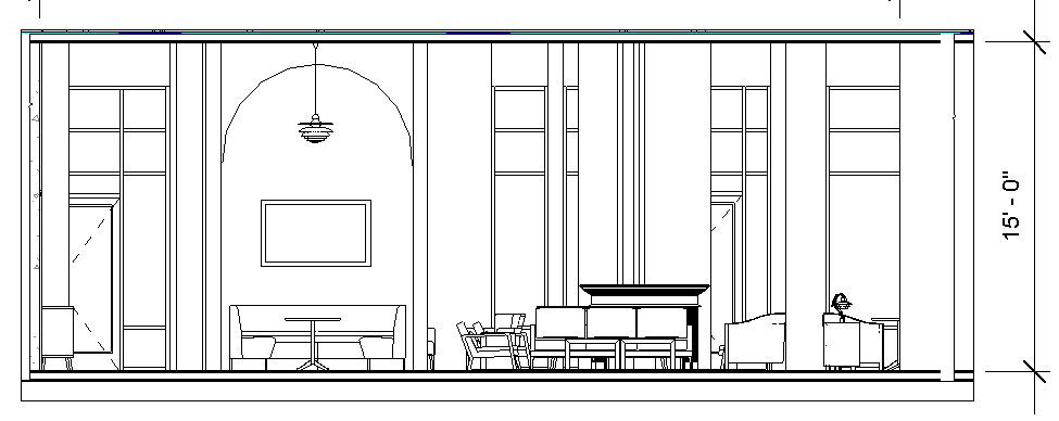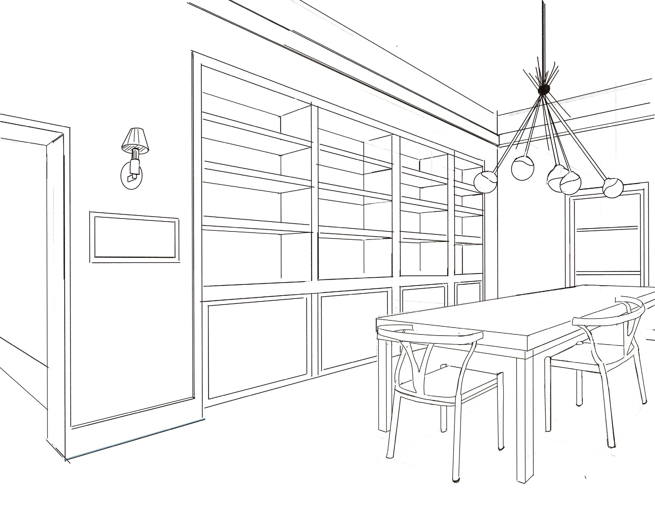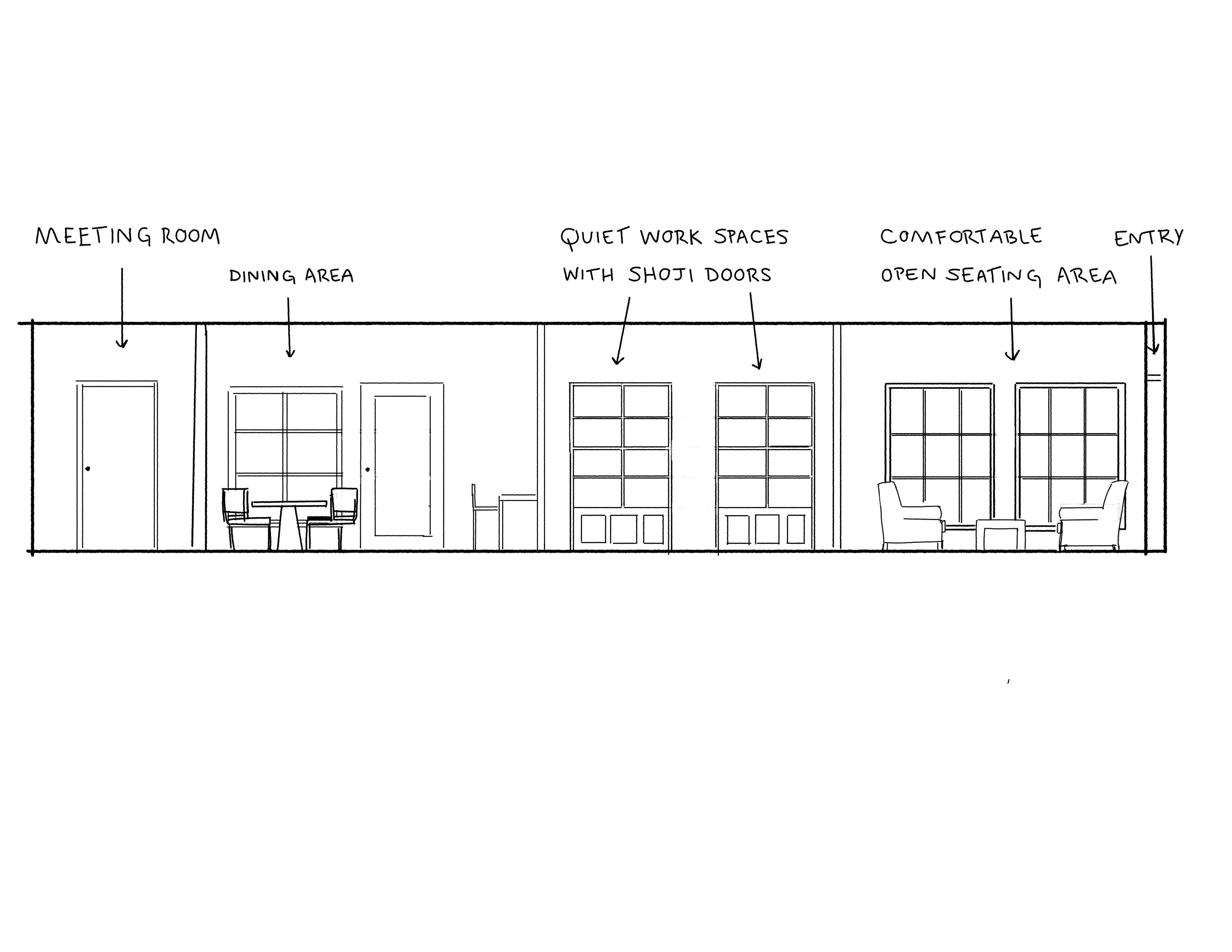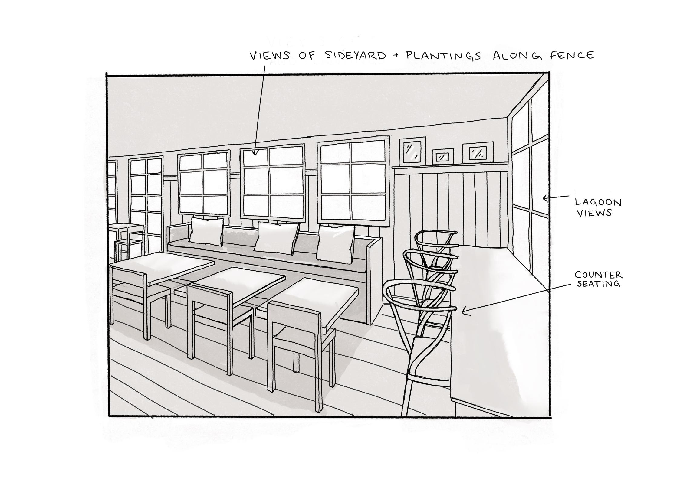 > An early sketch design ideation. The betweenopening the cocktail lounge and living room is half frosted glass with wood slats that offers privacy for guests in the lounge and allows light from the courtyard to filter through to the living room.
