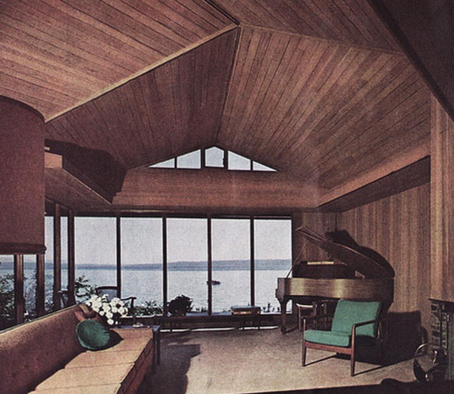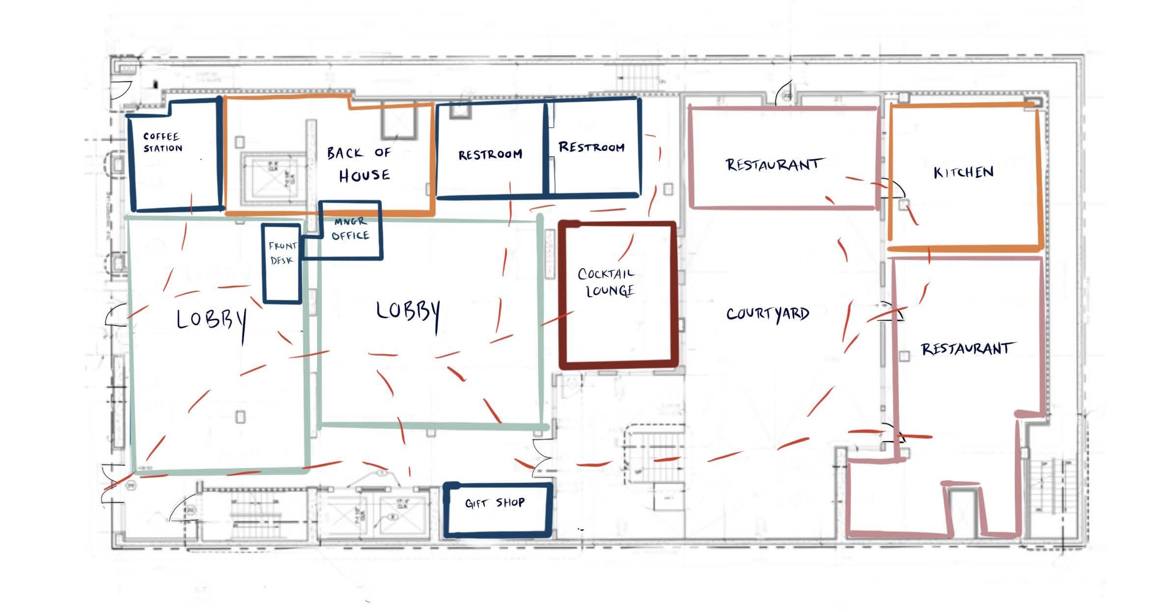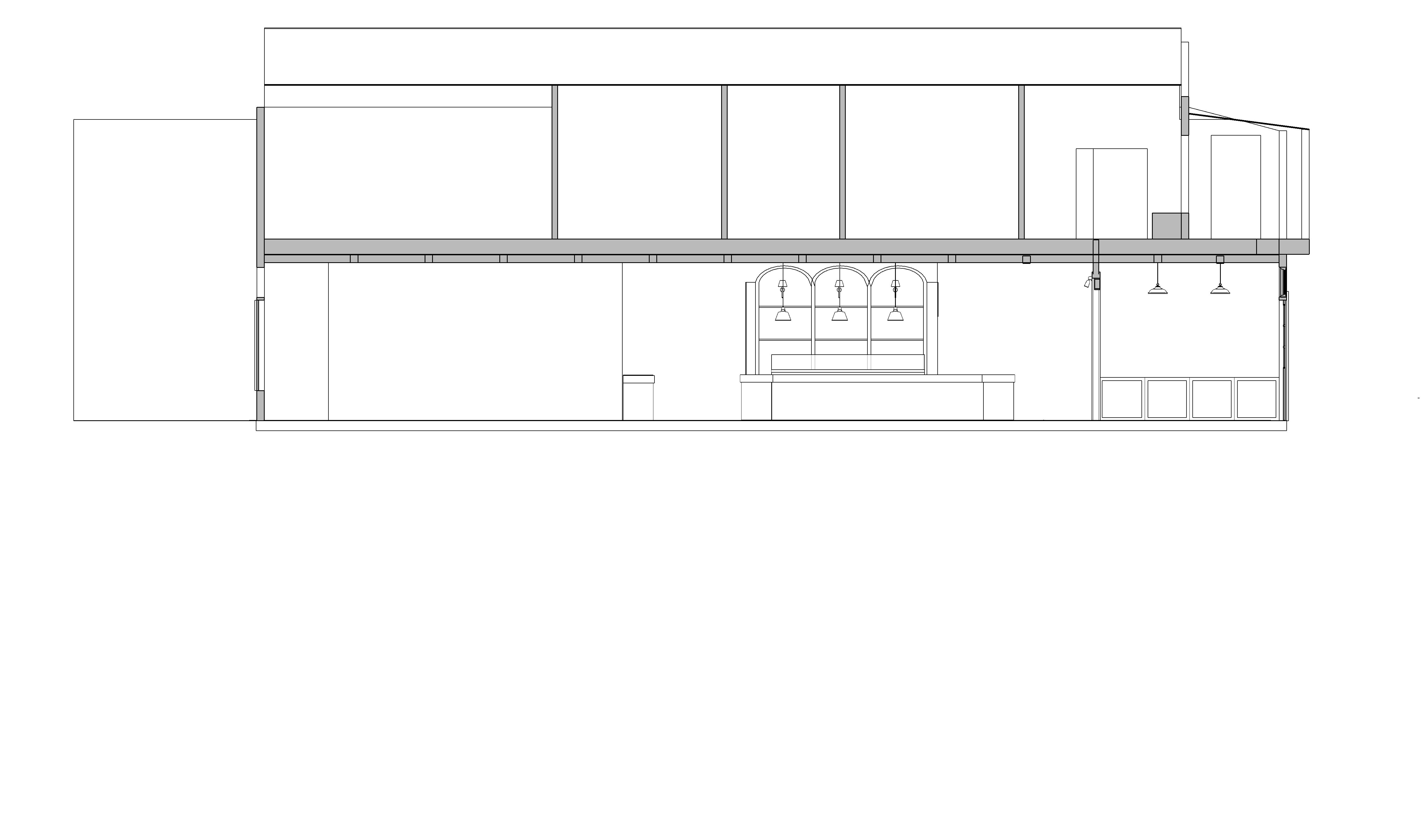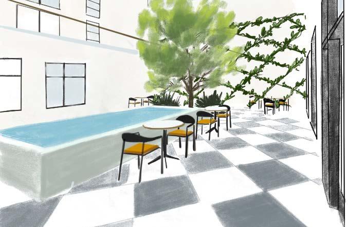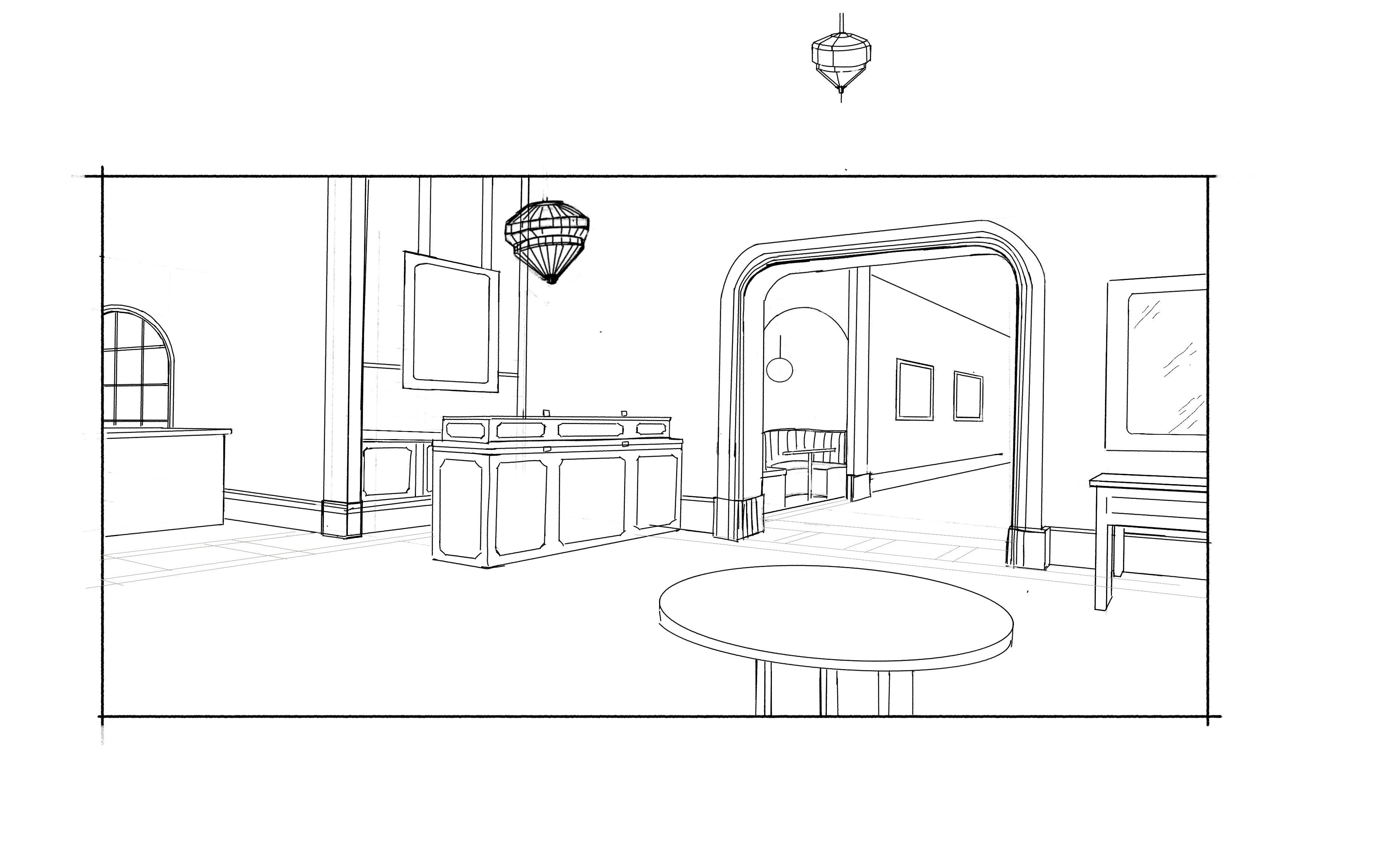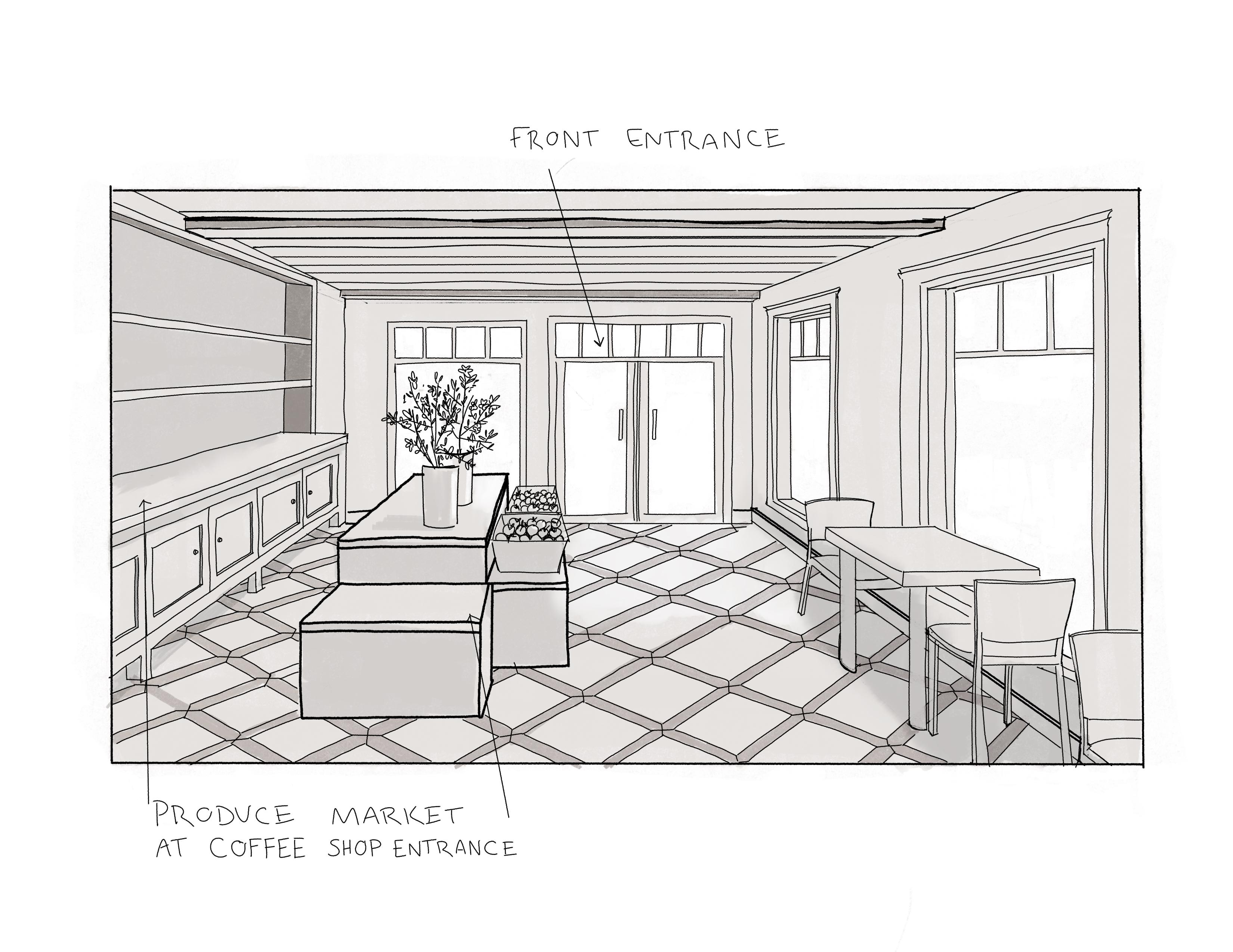 > An early sketch design ideation. The betweenopening the cocktail lounge and living room is half frosted glass with wood slats that offers privacy for guests in the lounge and allows light from the courtyard to filter through to the living room.