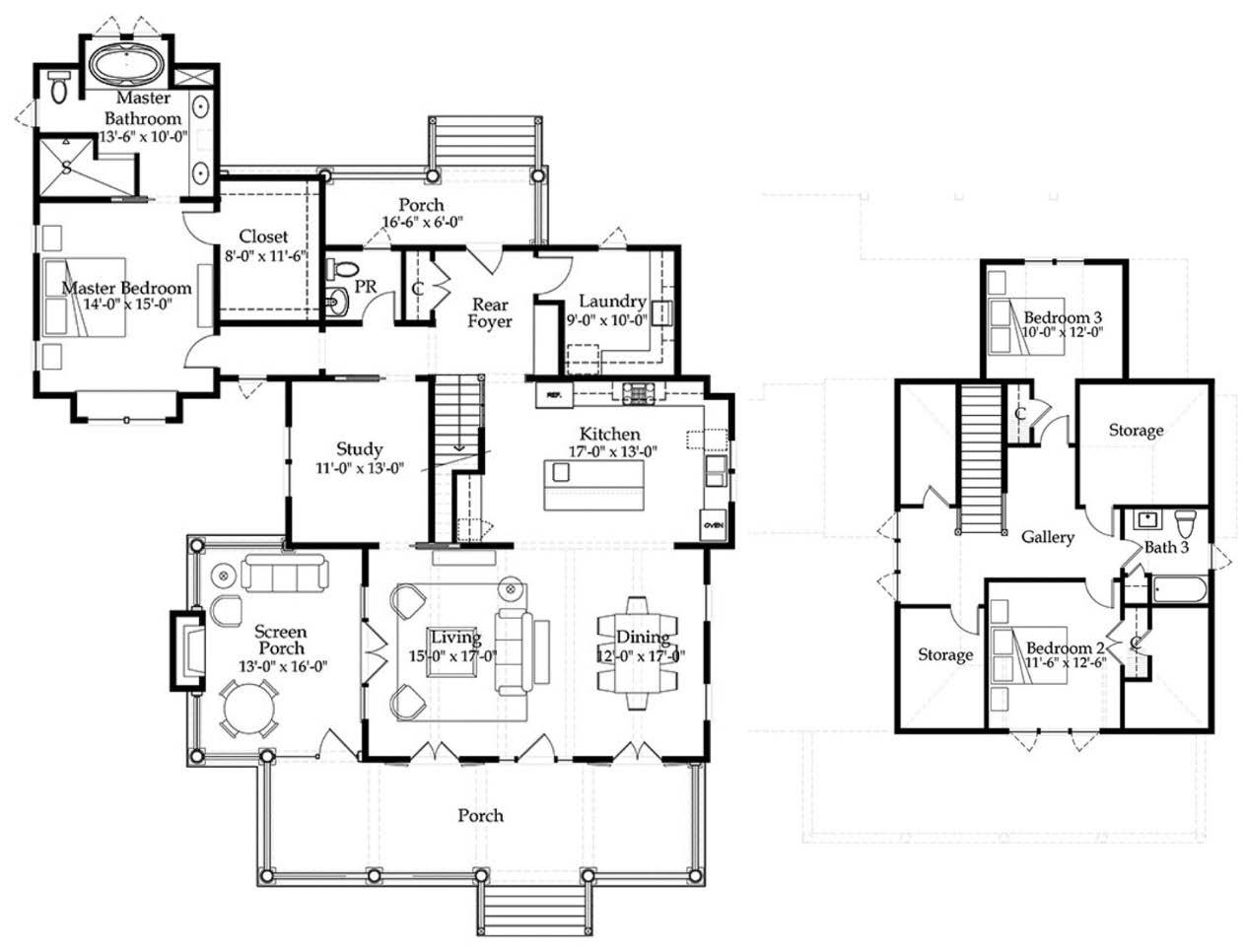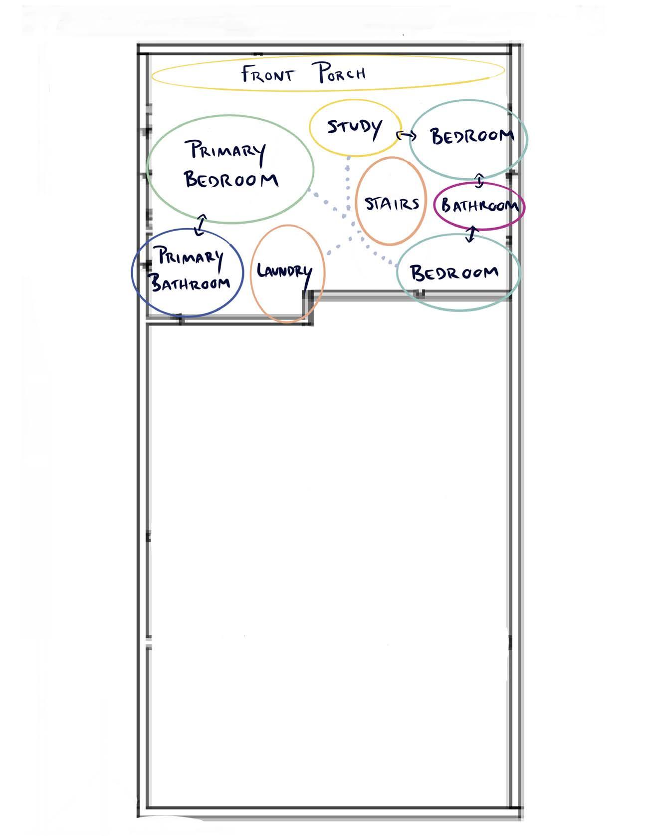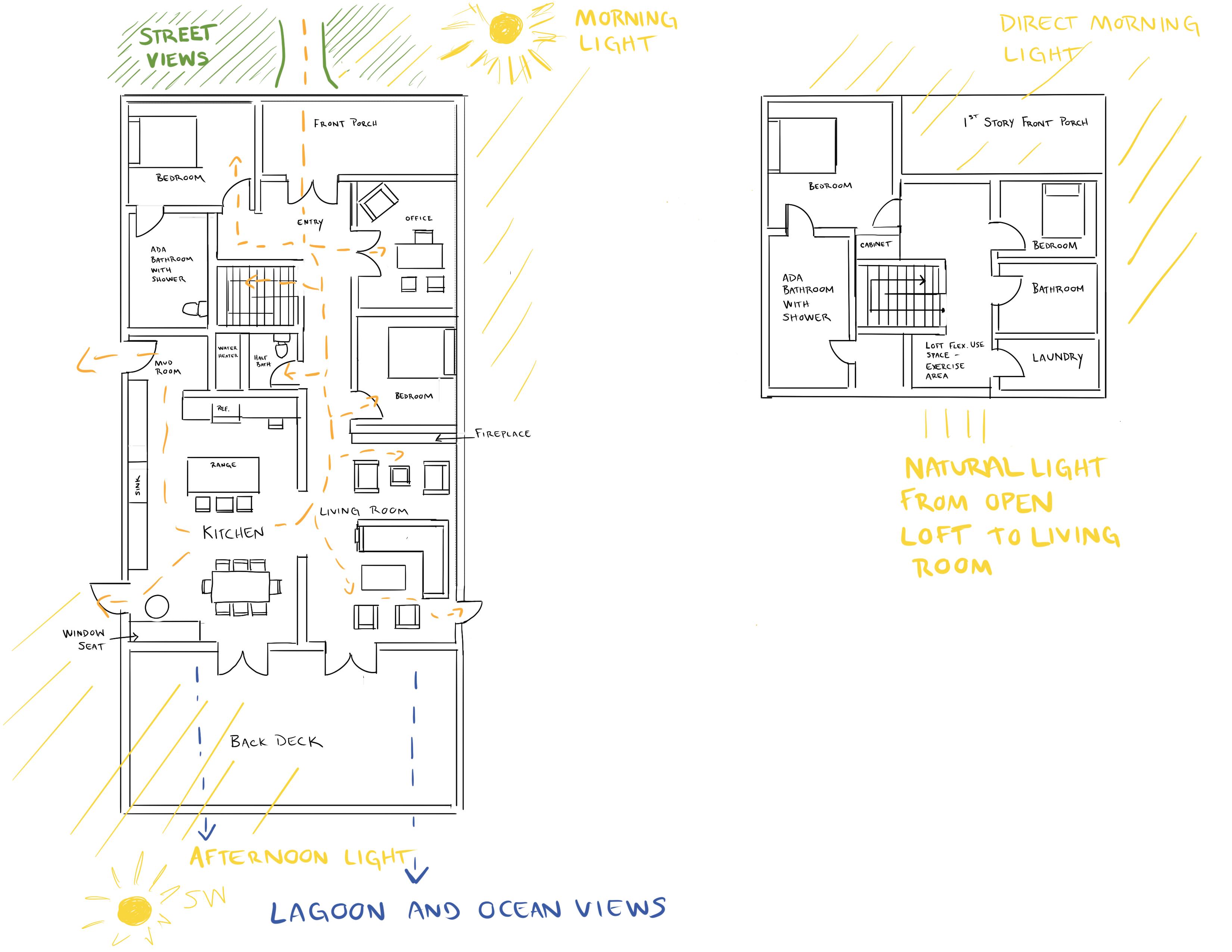 ^ Selected home floor plan features a partial second story to allow for tall ceilings on the first floor, a semi open concept living/dining/ kitchen, and additional living space in the screened porch.
