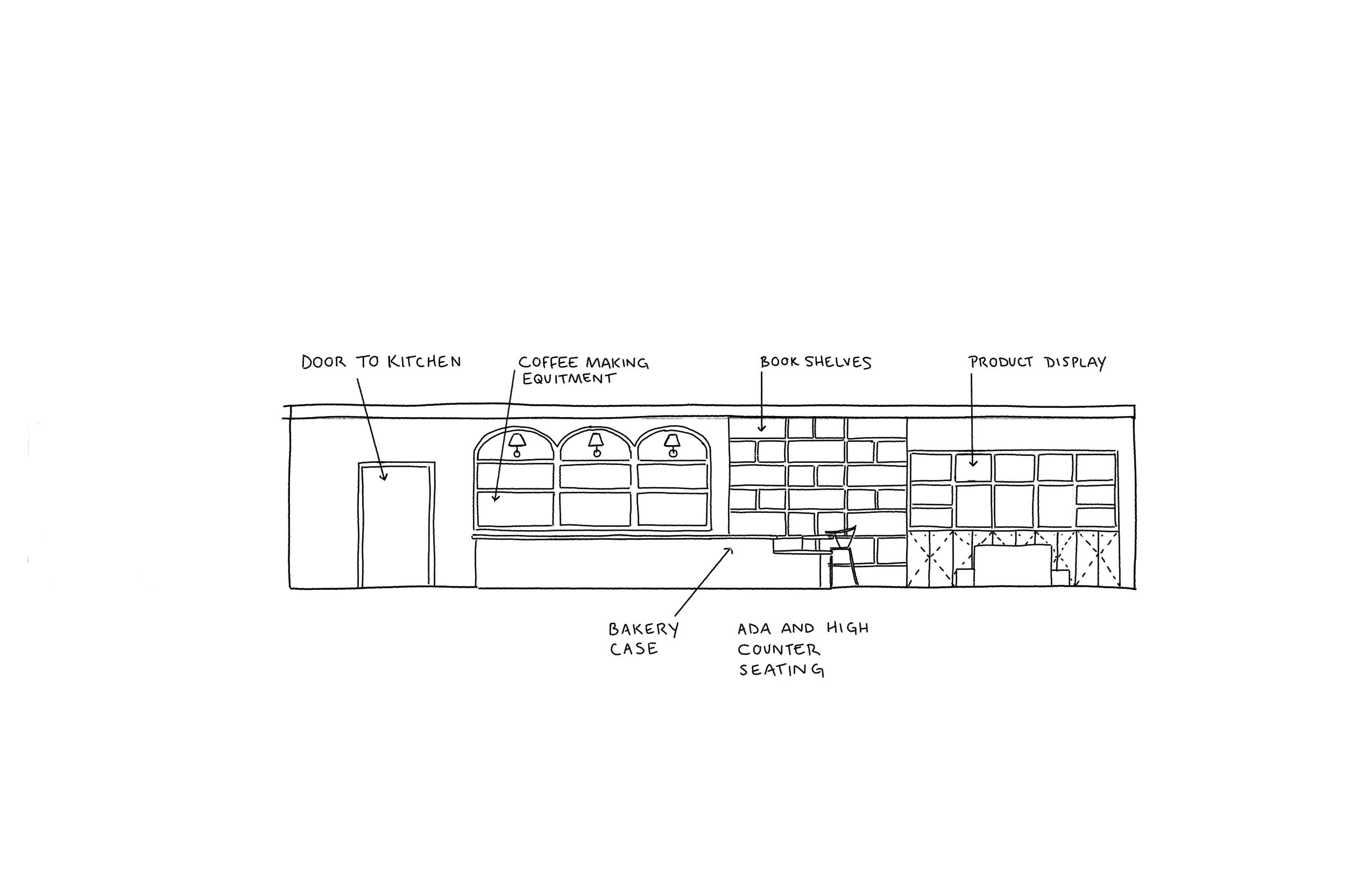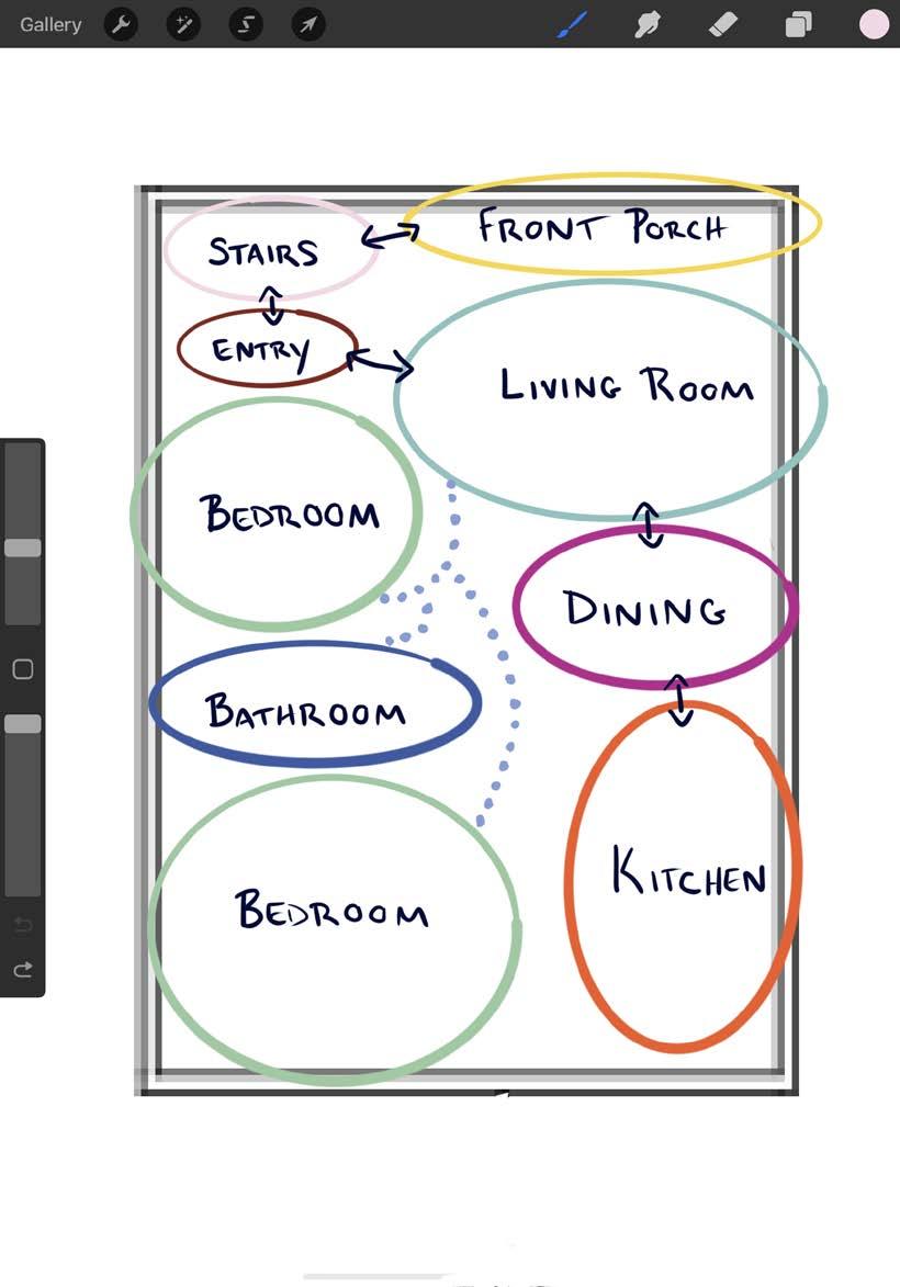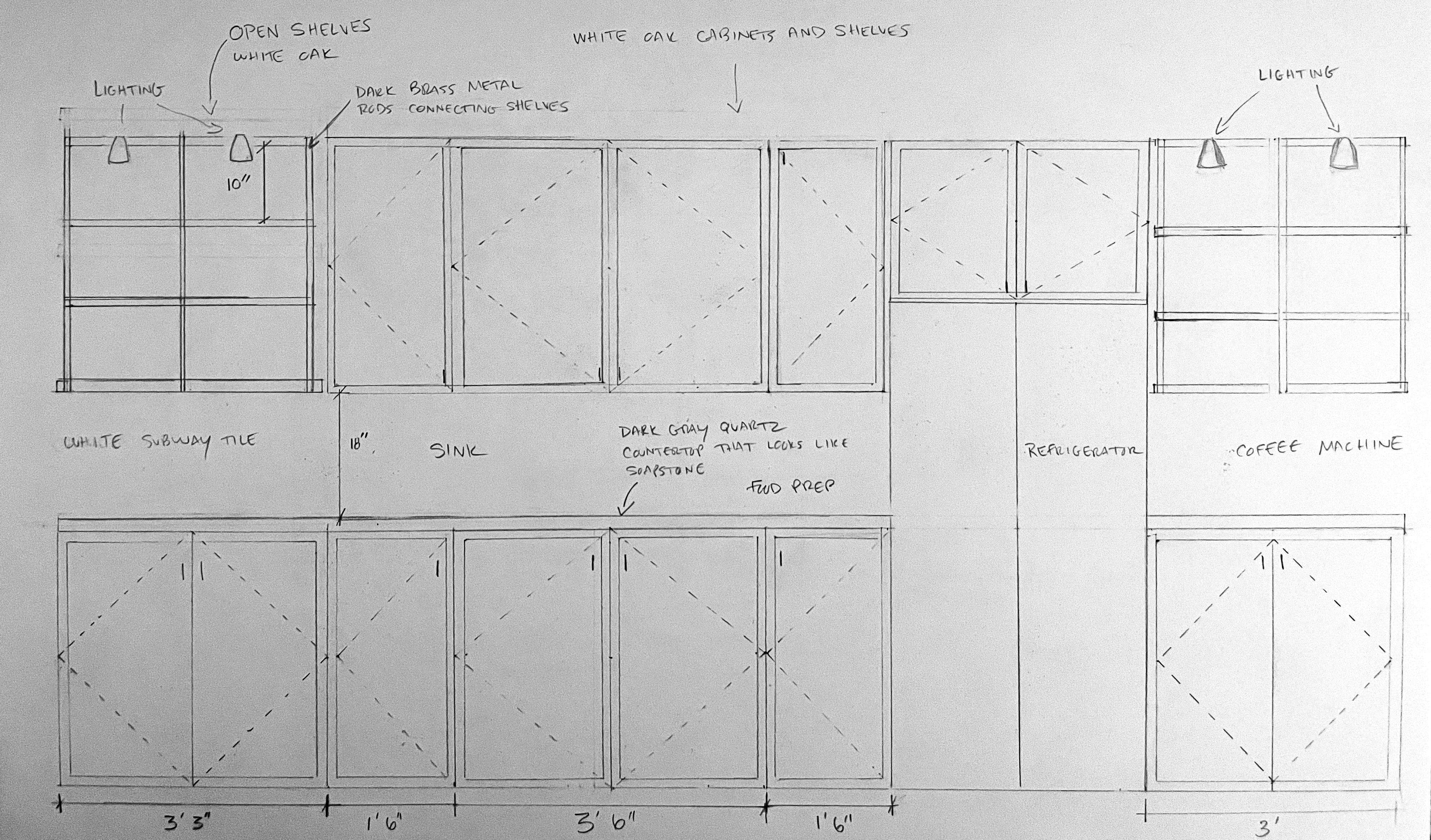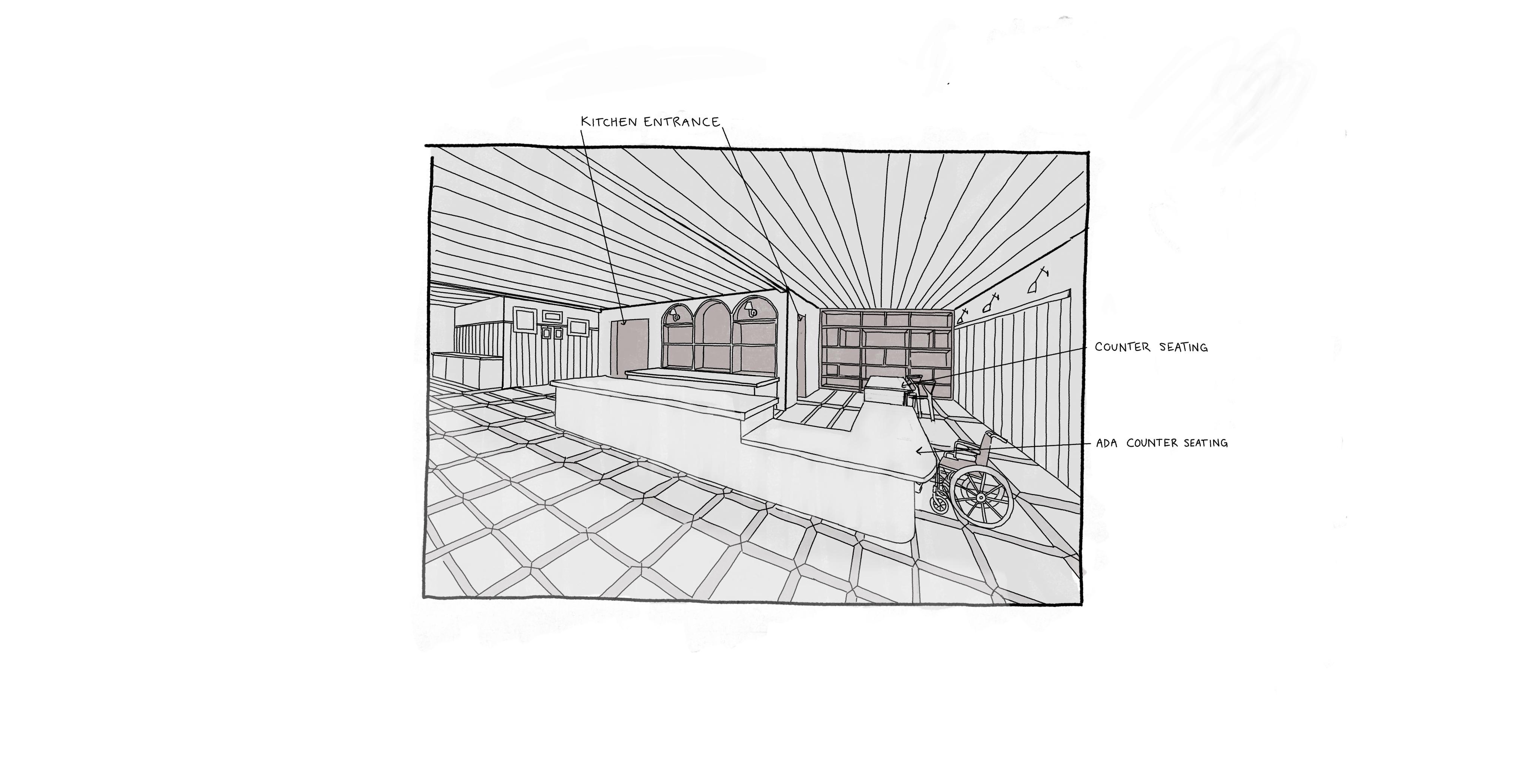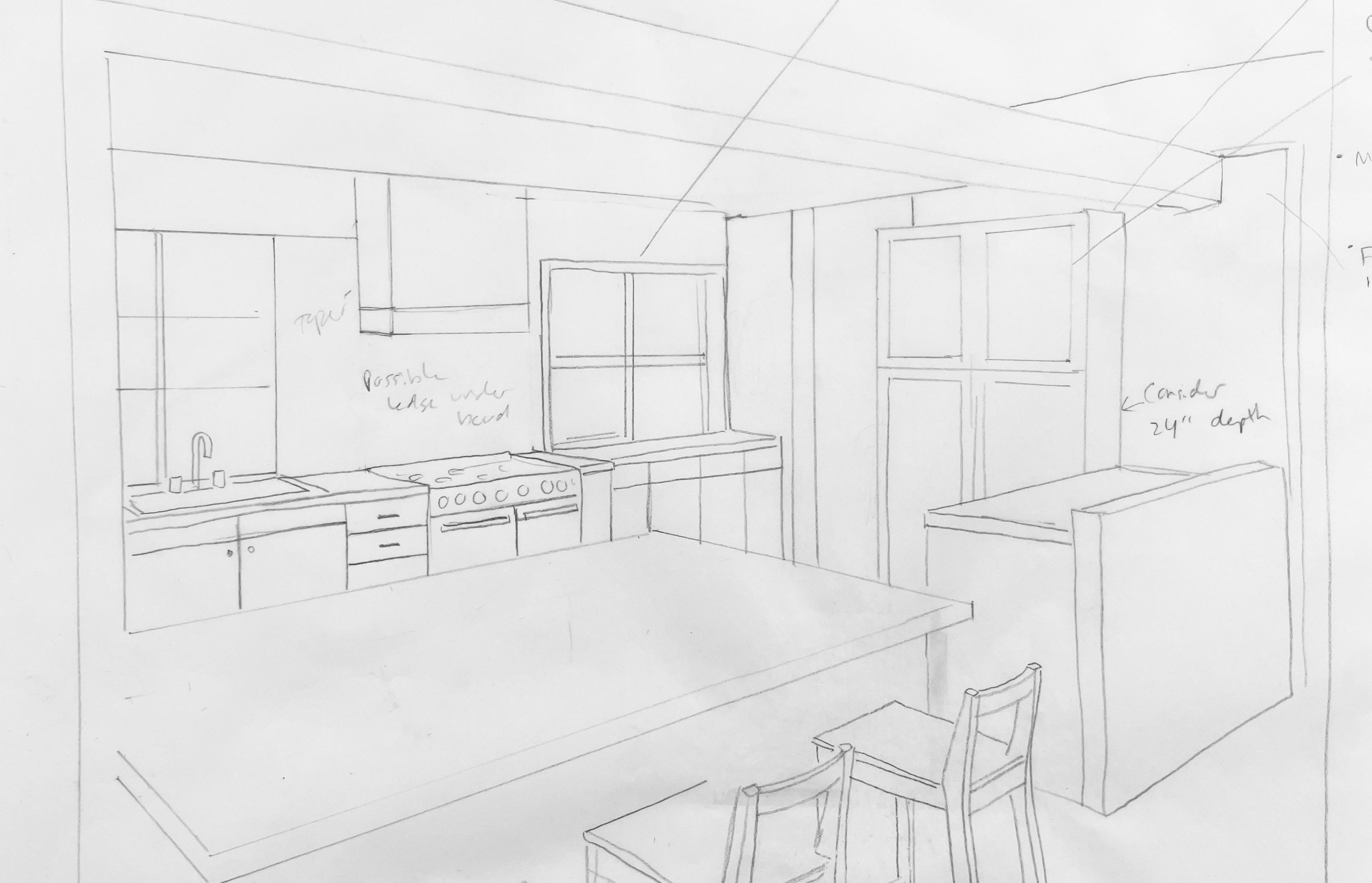 ^ Ideation sketch of kitchen remodel-- open walls to add bar seating, move stove and refrigerator.