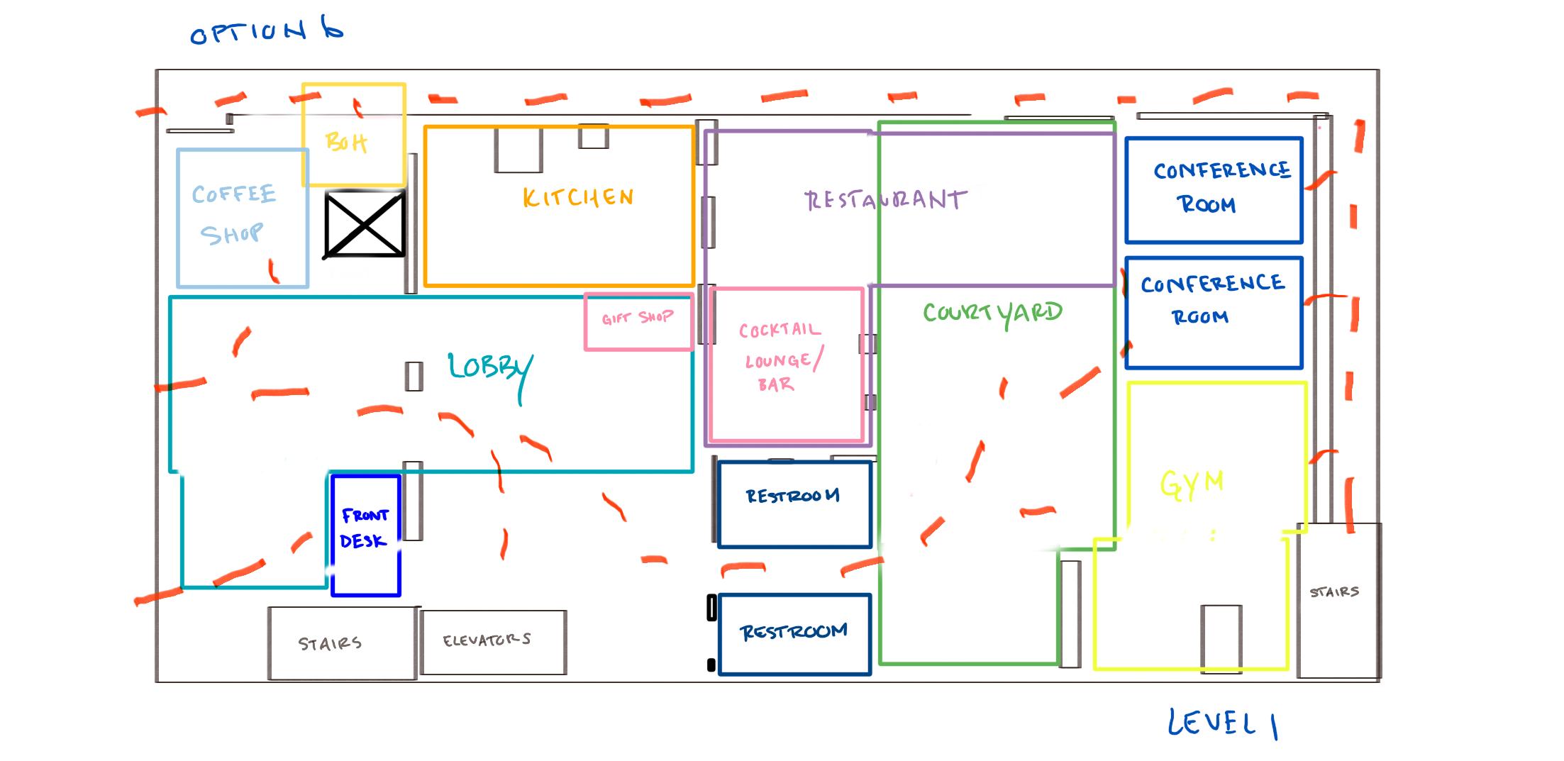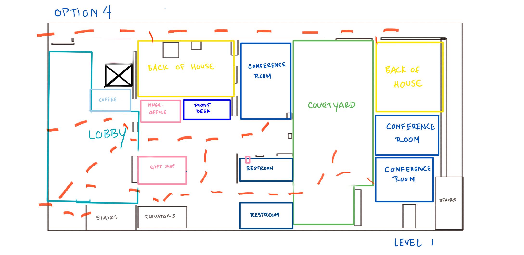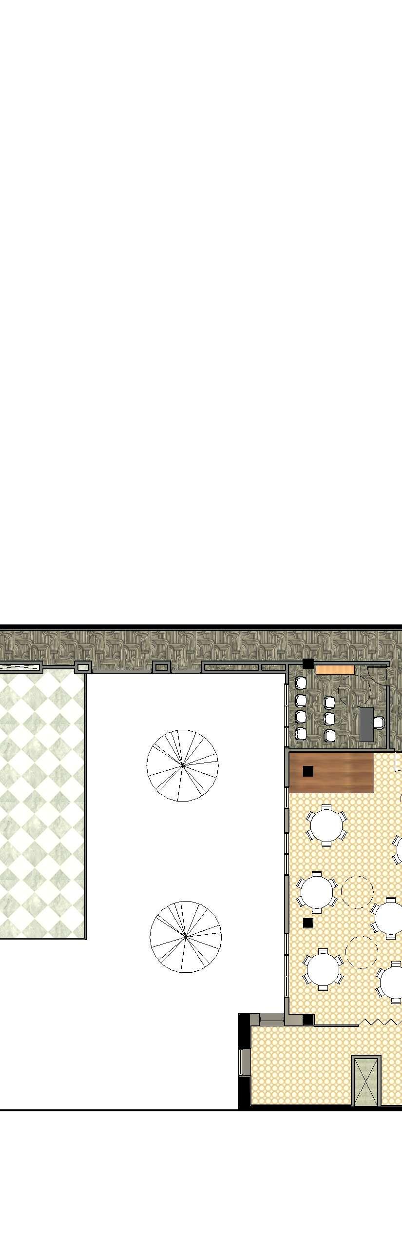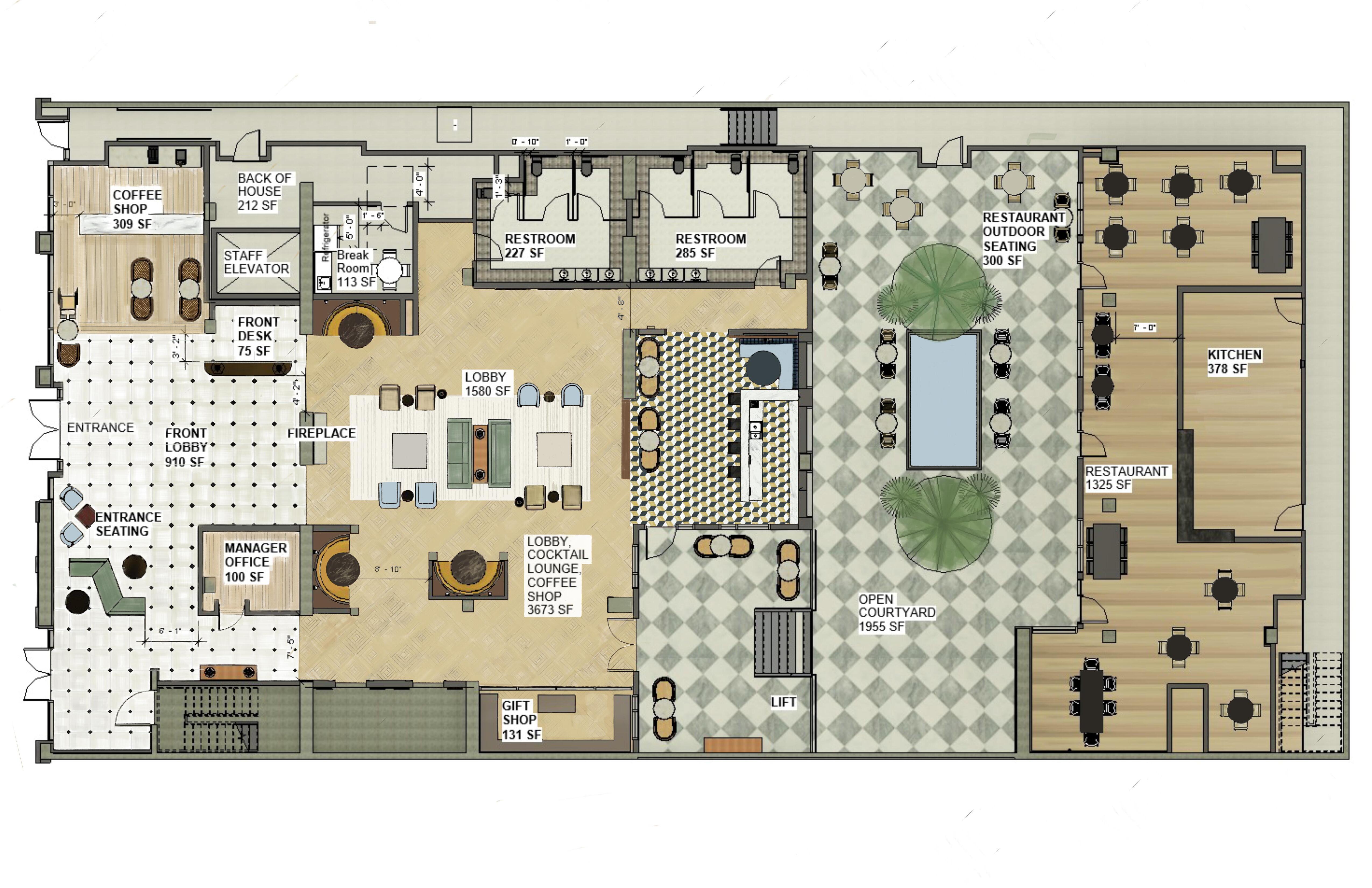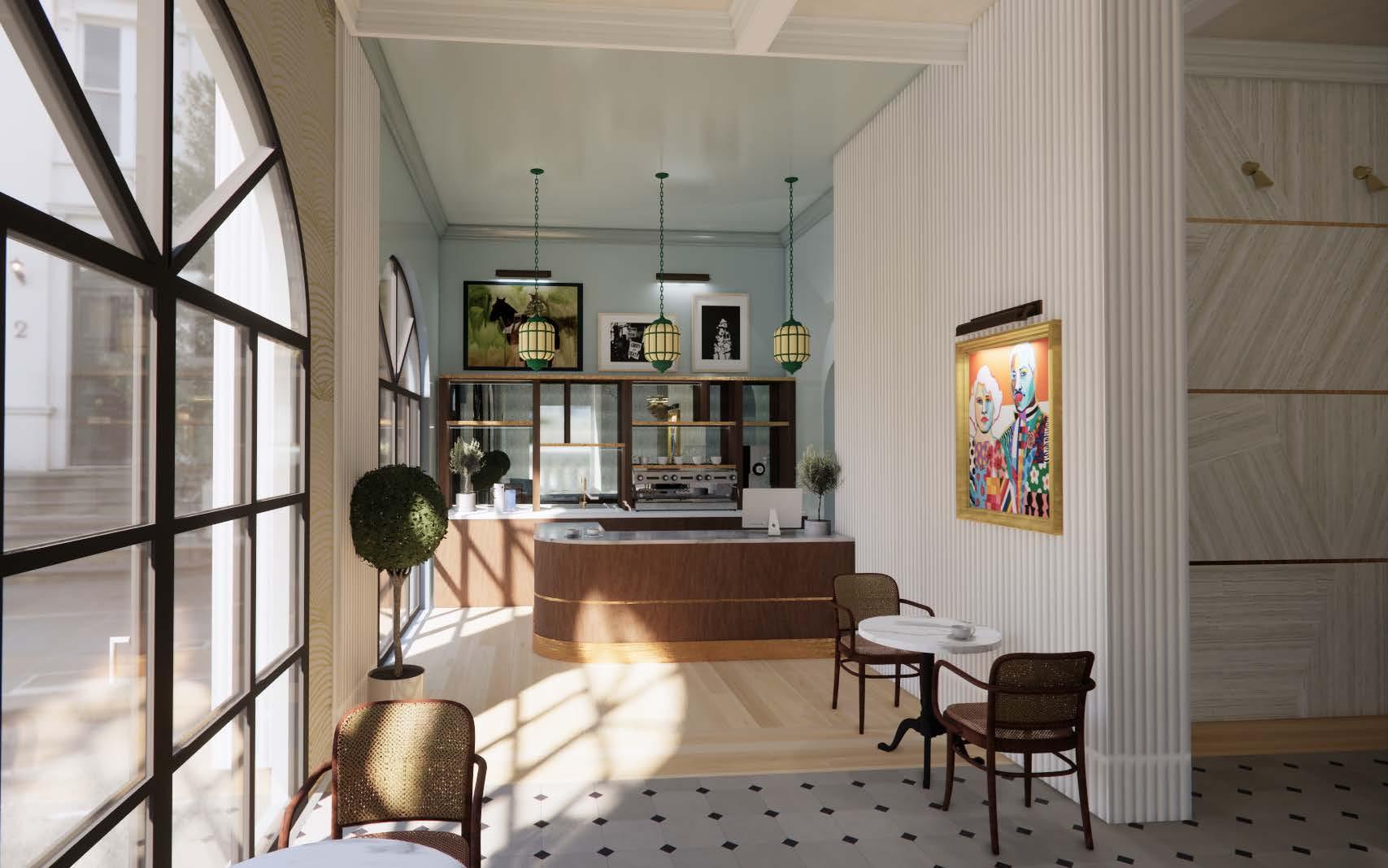 < Coffee shop adjacent to front lobby draws local customers as well as hotel guests. It features eye-catching, statement making artwork.