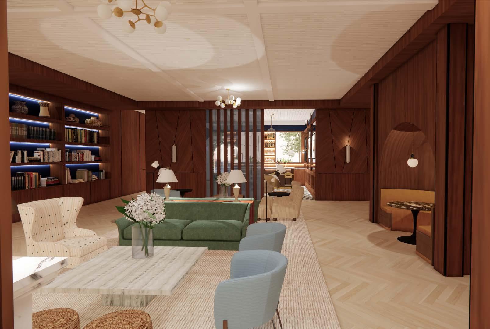> The living room seating area between the front lobby and cocktail lounge offers living room like seating around the fireplace and cozy alcove seating on the periphery.