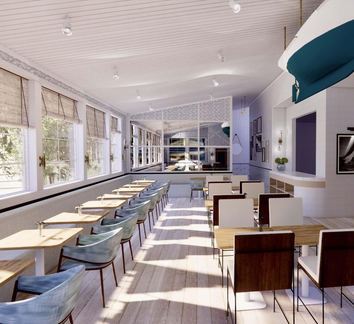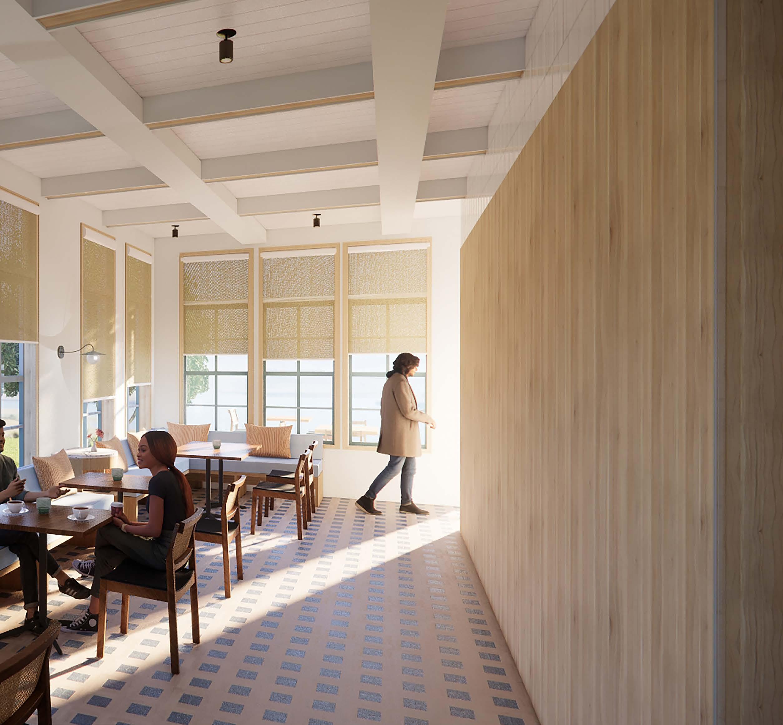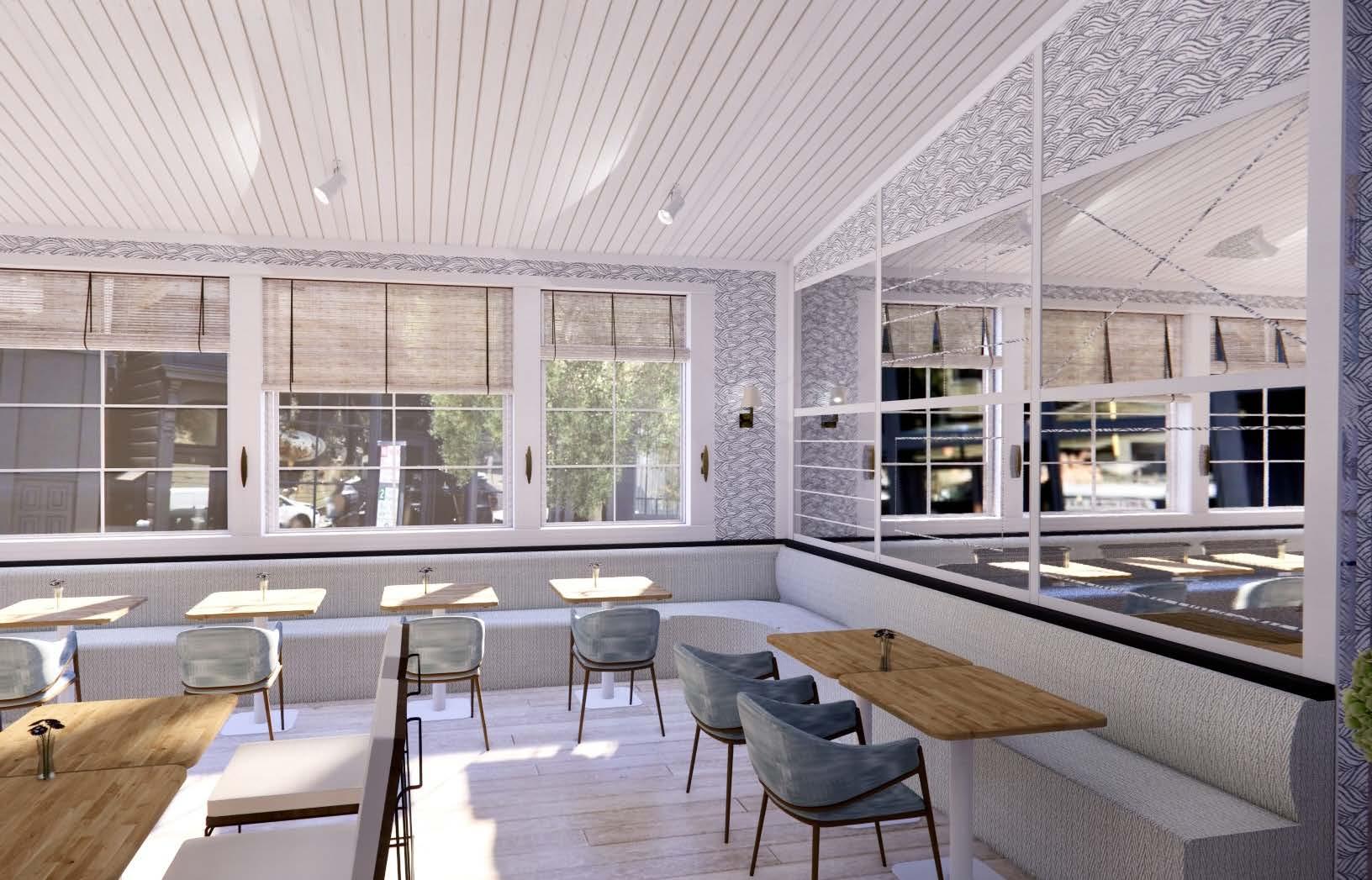 Natural wood flooring and millwork, terracotta tiles at the bar help guests feel connected to nature. A custom mirror design of sailing flags reflects light from the front windows, enhancing the ambiance with natural sunlight.