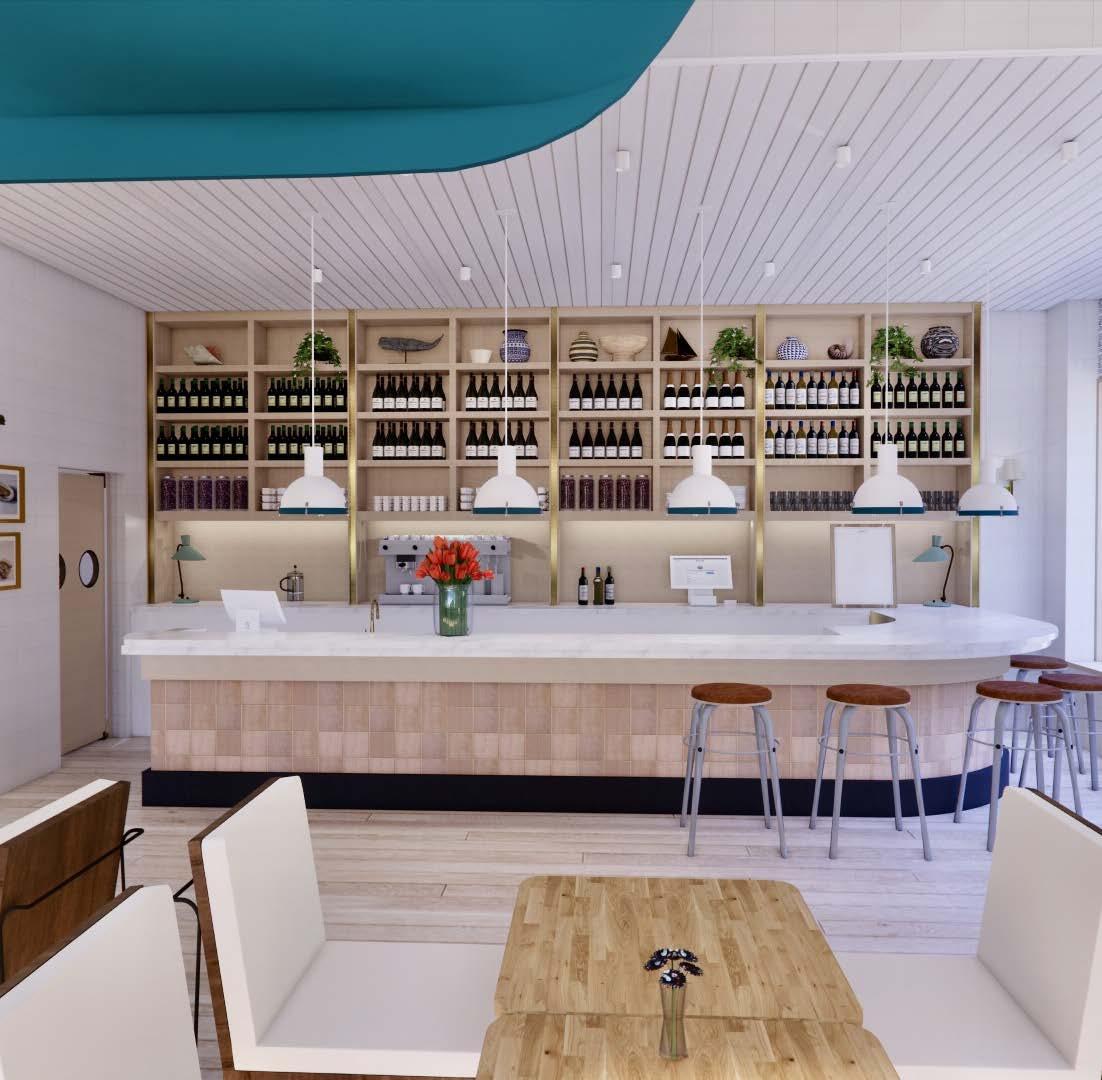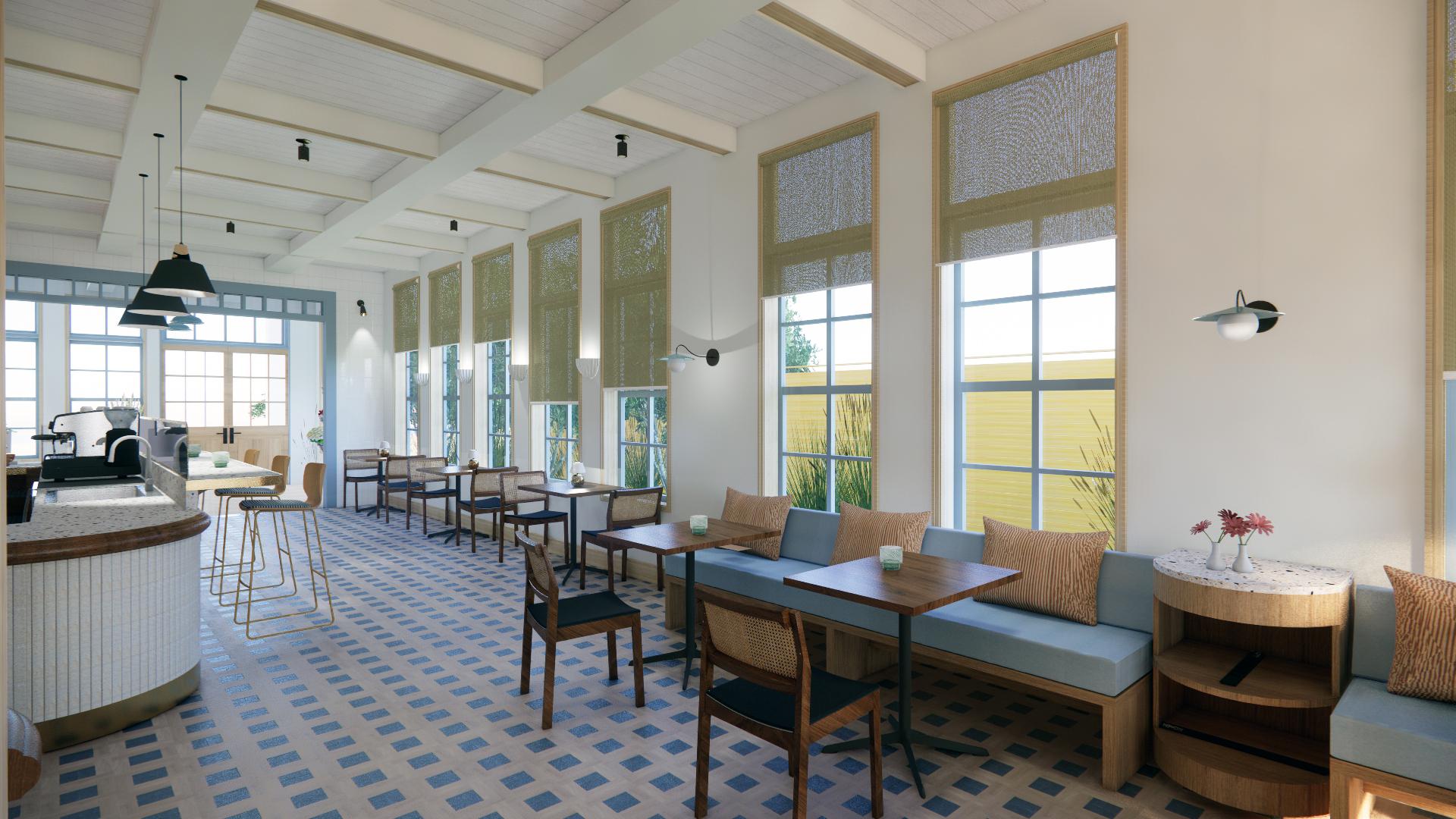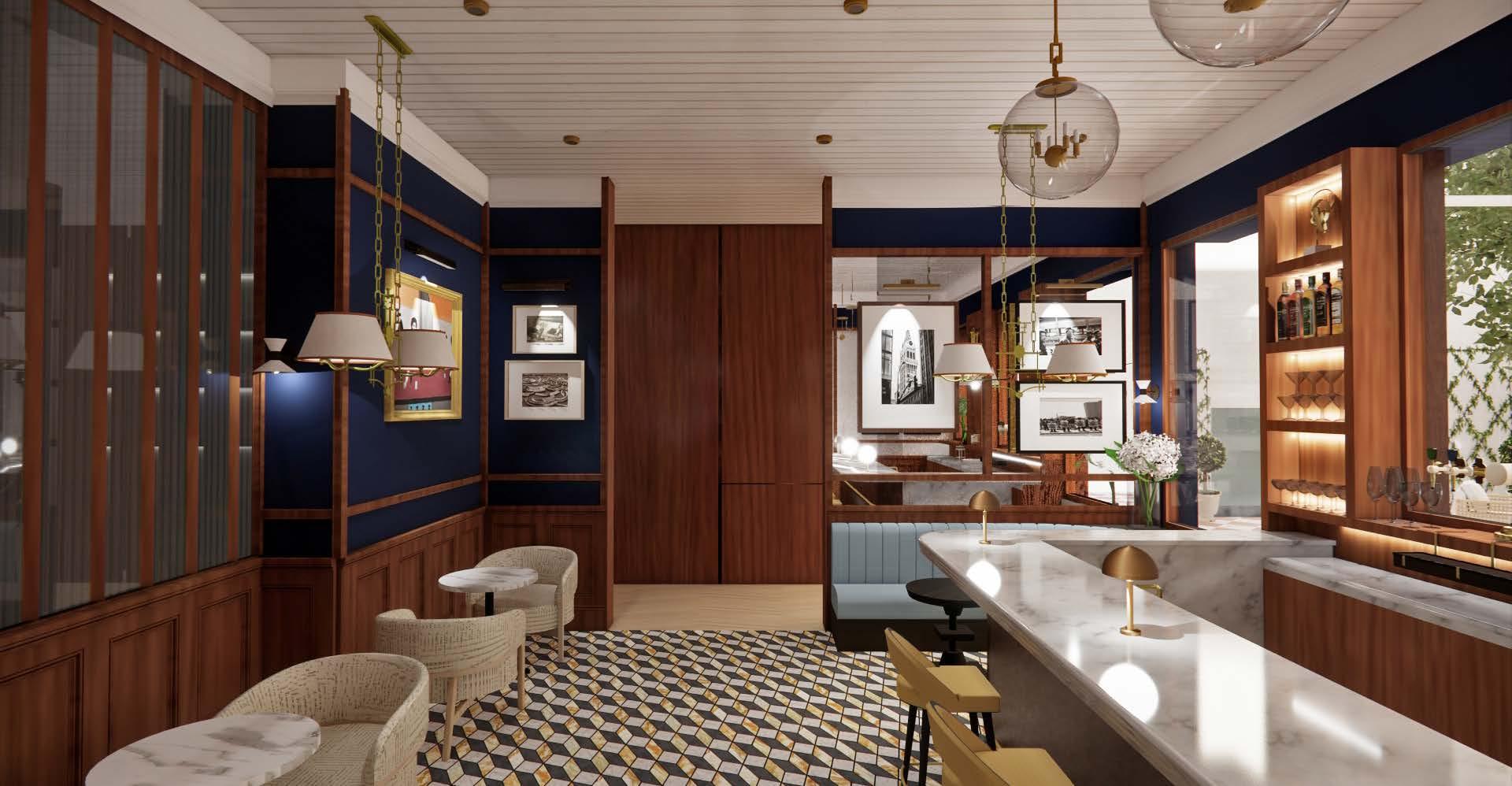 Natural wood flooring and millwork, terracotta tiles at the bar help guests feel connected to nature. A custom mirror design of sailing flags reflects light from the front windows, enhancing the ambiance with natural sunlight.