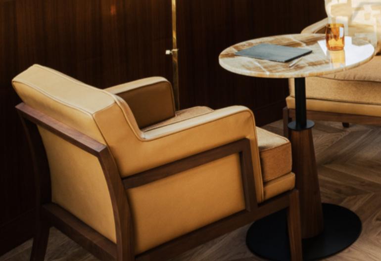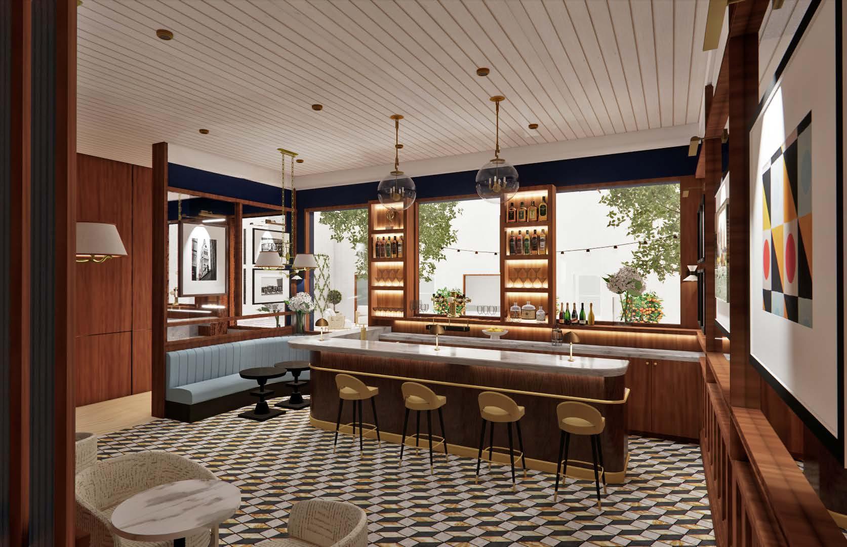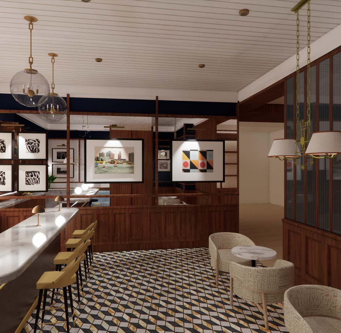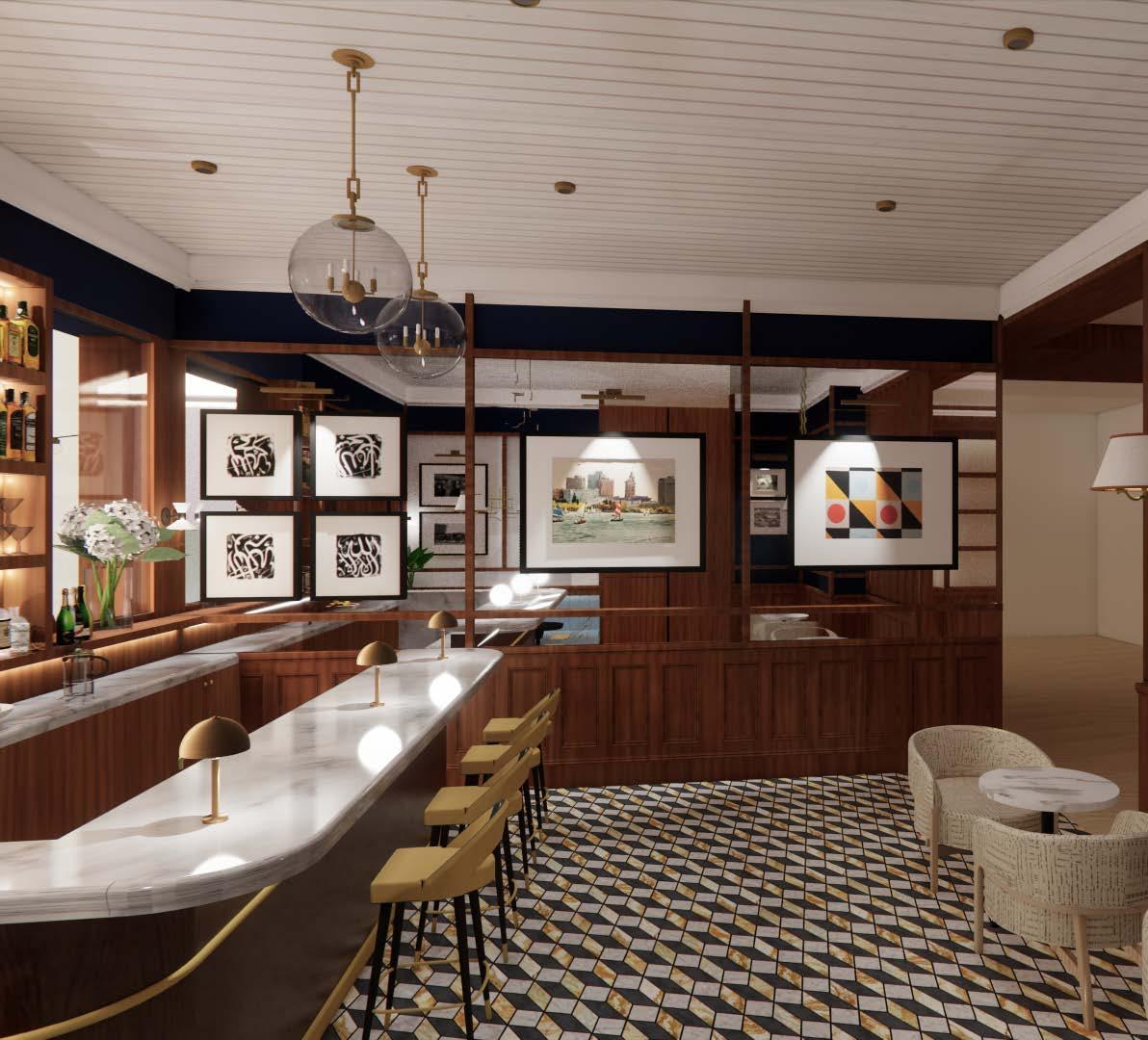 > The cocktail lounge. Mirrored panels bounce natural light and views from the internal courtyard. Walnut paneling, tumbling block marble floor and deep blue walls are reminiscent of traditional nautical elements.