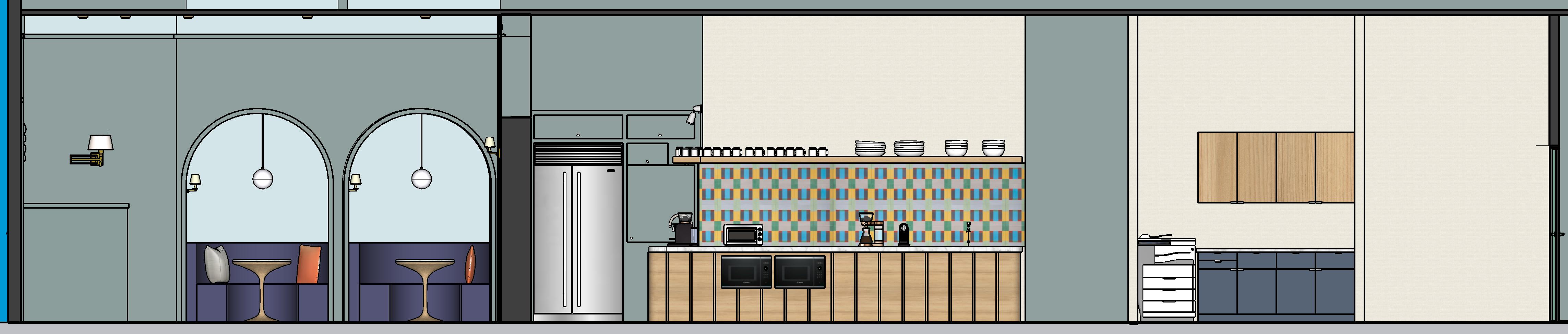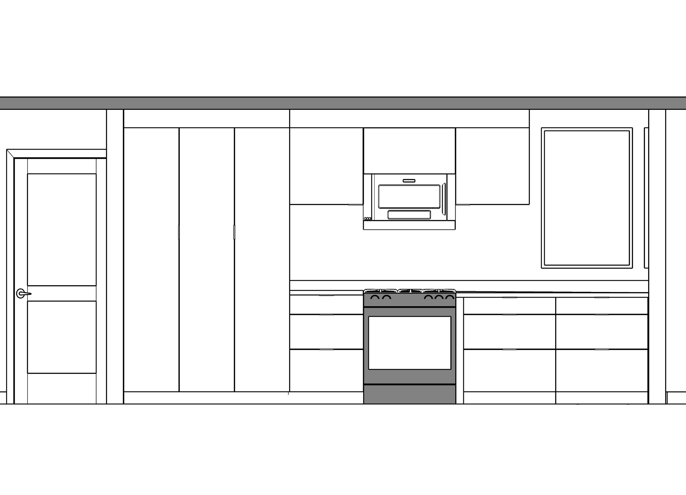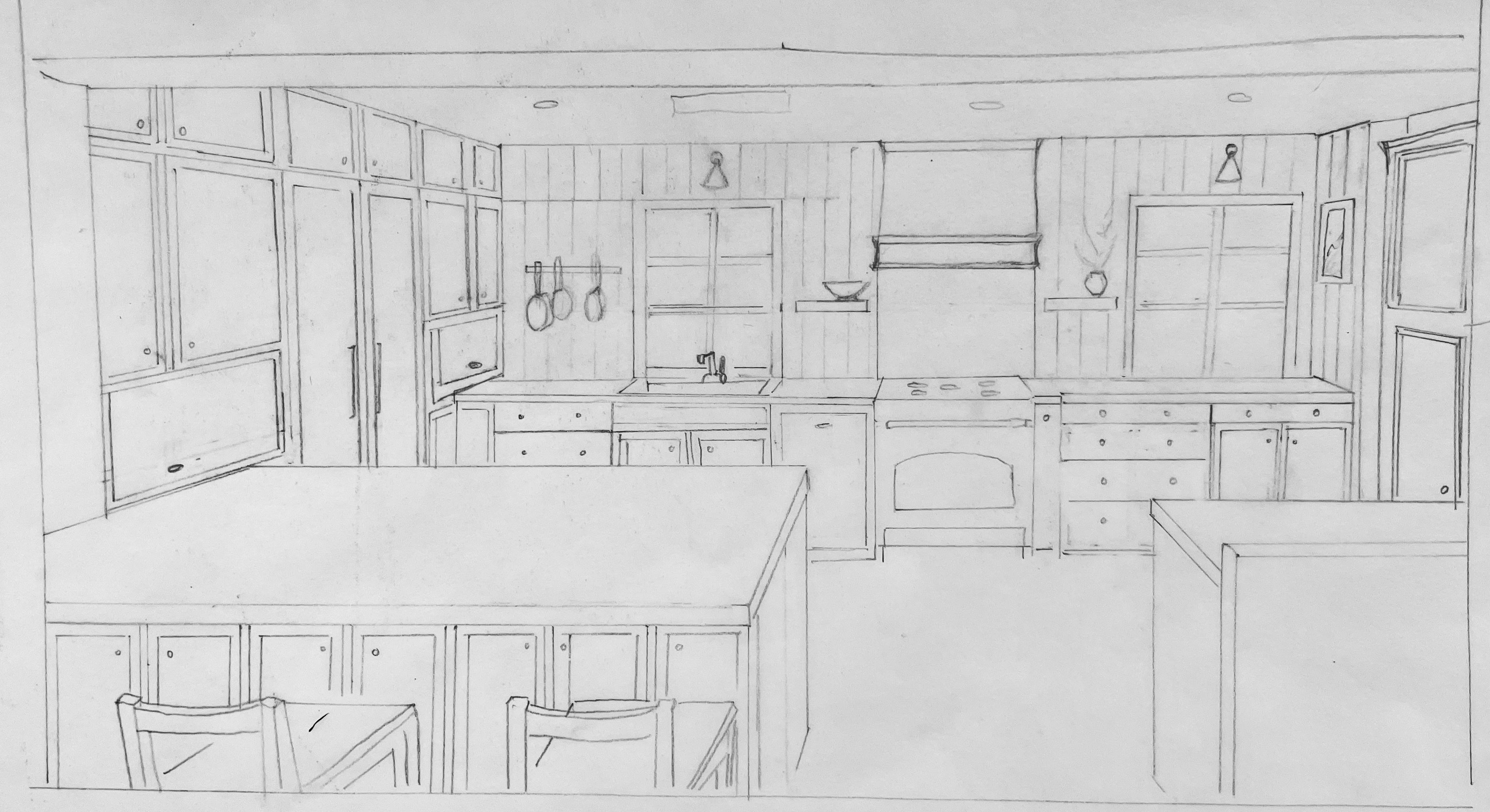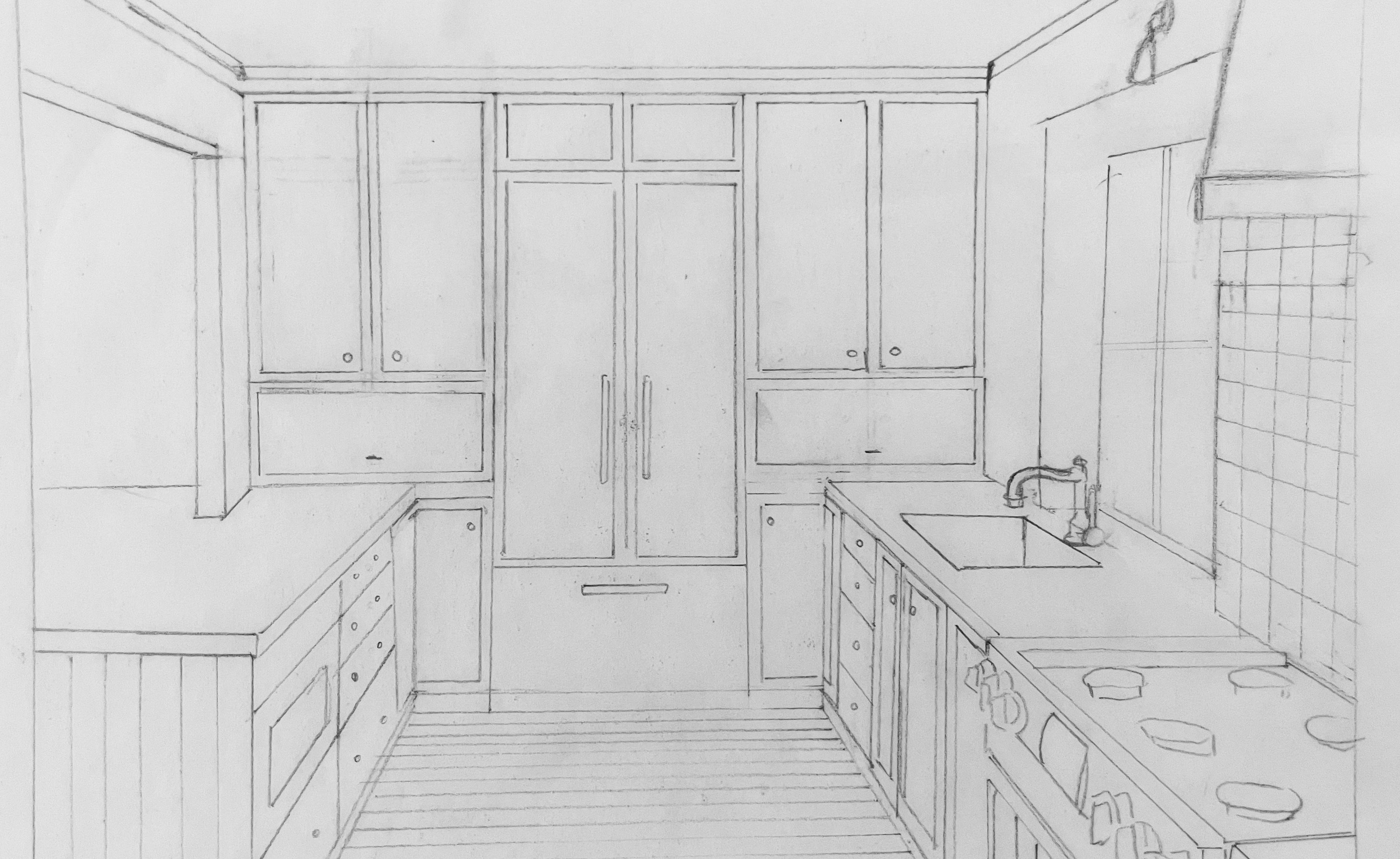 ^ One point perspective showing the cabinet layout surrounding refrigerator.